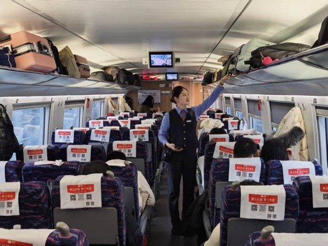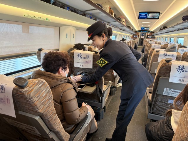 2月2日,由青岛北开往福州的G3309次列车上,列车长芦睿在静音车厢提醒旅客乘车保持安静。翟祚珩/摄