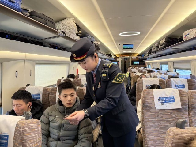 2月2日,由天津西开往青岛的G523次列车上,列车长金瑜瑜为旅客查询车票,进行登记。翟祚珩/摄