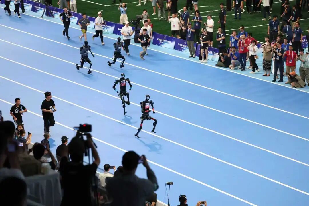在2025世界人形机器人运动会最后一天的100米决赛 图片来源:北京日报 摄影 程功