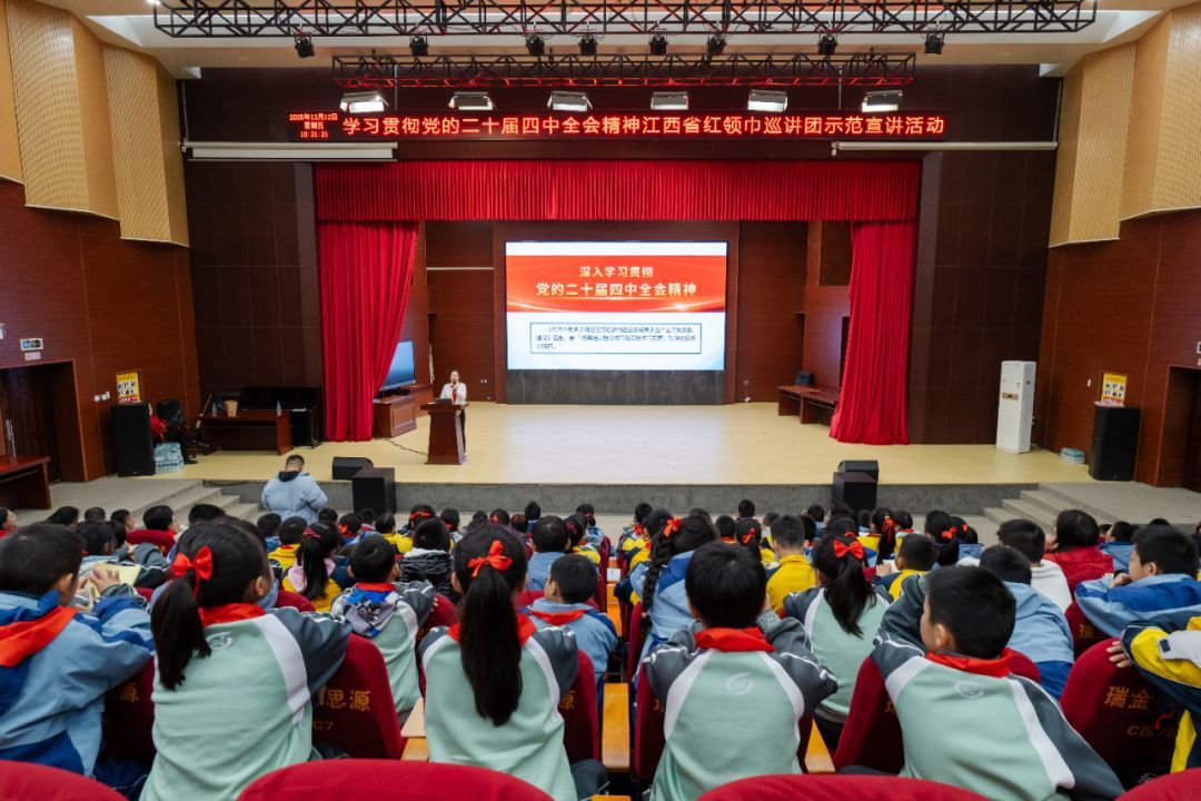 江西省红领巾巡讲团成员走进赣州市瑞金、于都、新余等地,开展学习贯彻党的二十届四中全会精神示范宣讲活动,1000余名少先队员、少先队辅导员现场聆听宣讲。宣讲活动中,巡讲团成员立足各自领域,以生动的语言、鲜活的故事宣传全会精神,激励广大少先队员牢记领袖嘱托、勇担时代重任。