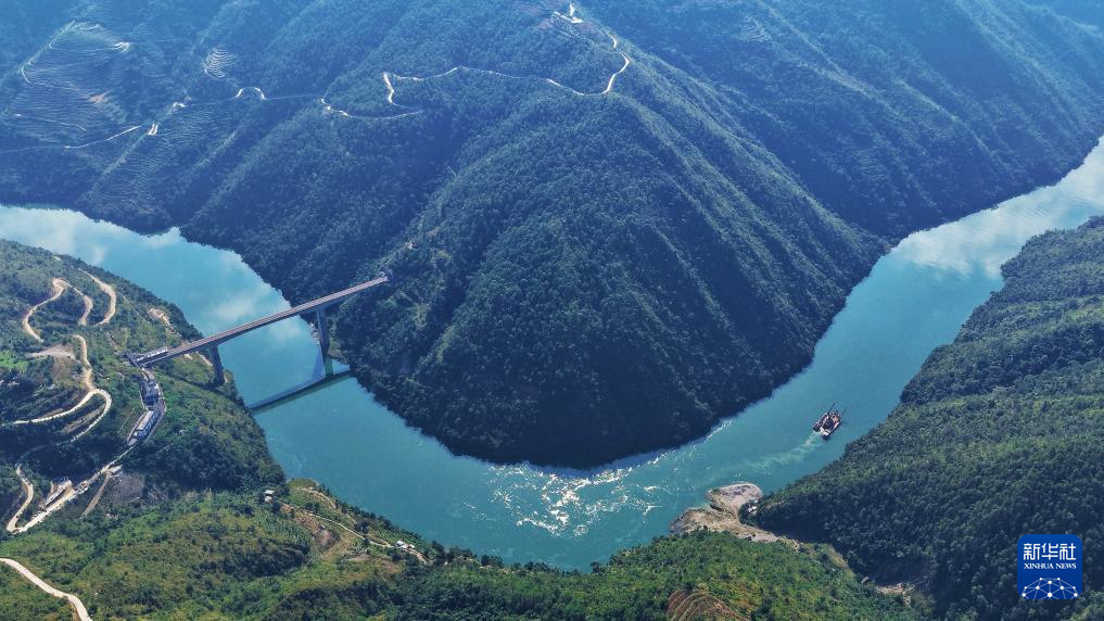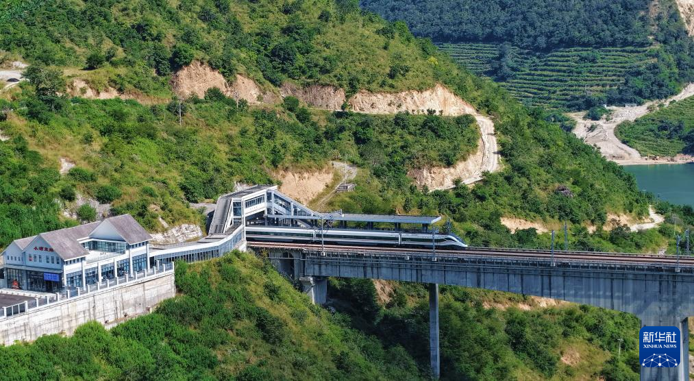 10月30日,一列动车组列车经过小湾东站(无人机照片)。