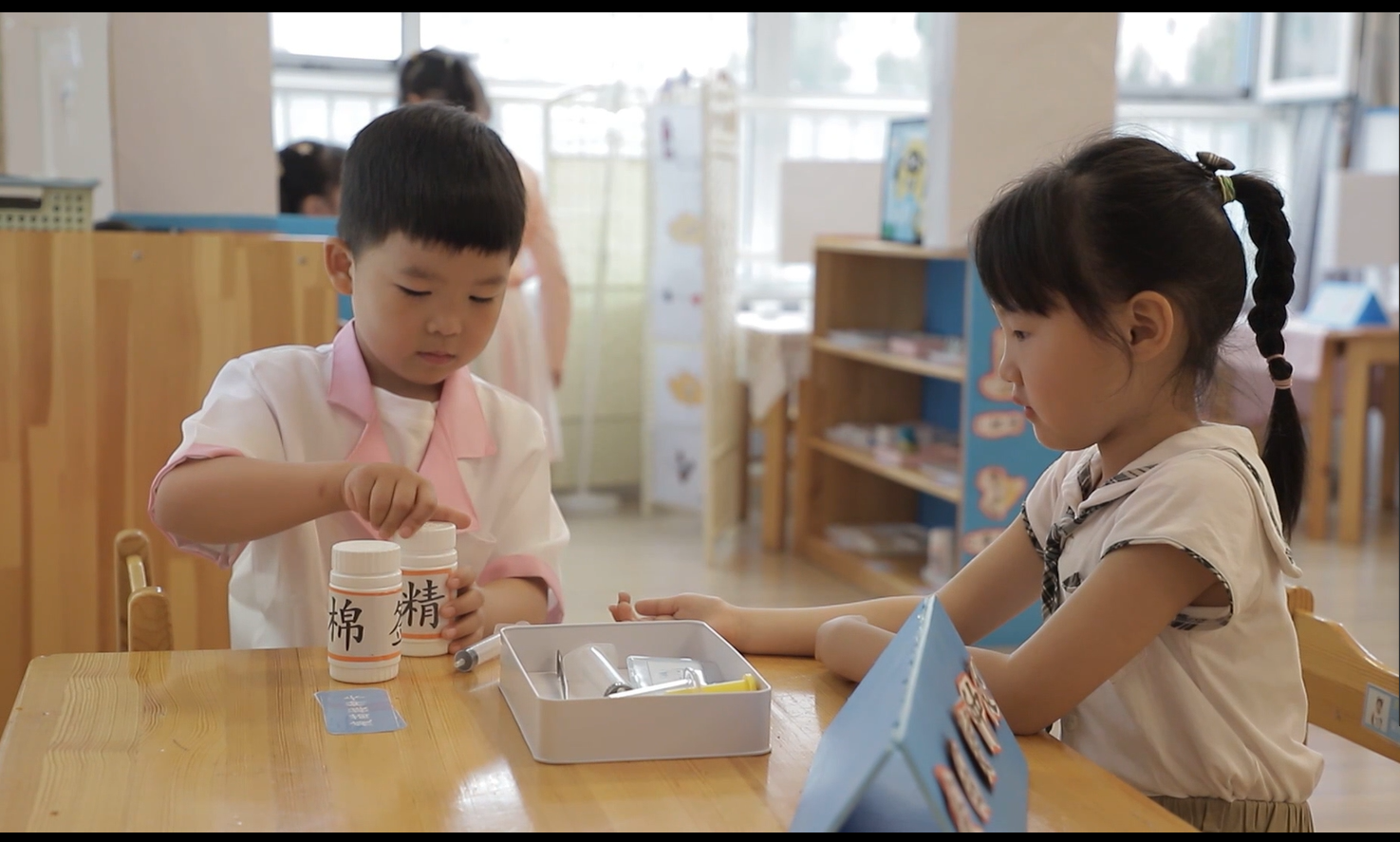 “医院”情景的融入,贴近孩子们的生活,激发了孩子们参与的兴趣。在各个区域,都能看到孩子们扮演的“小医生”、“小护士”、“小药师”、“接种医师”、“小病人”,在游戏中体现了孩子们的自由、自主、自立和自信。通过这样的区域设置,让孩子真正成为游戏的主人。帮助孩子成为更好的自己。
