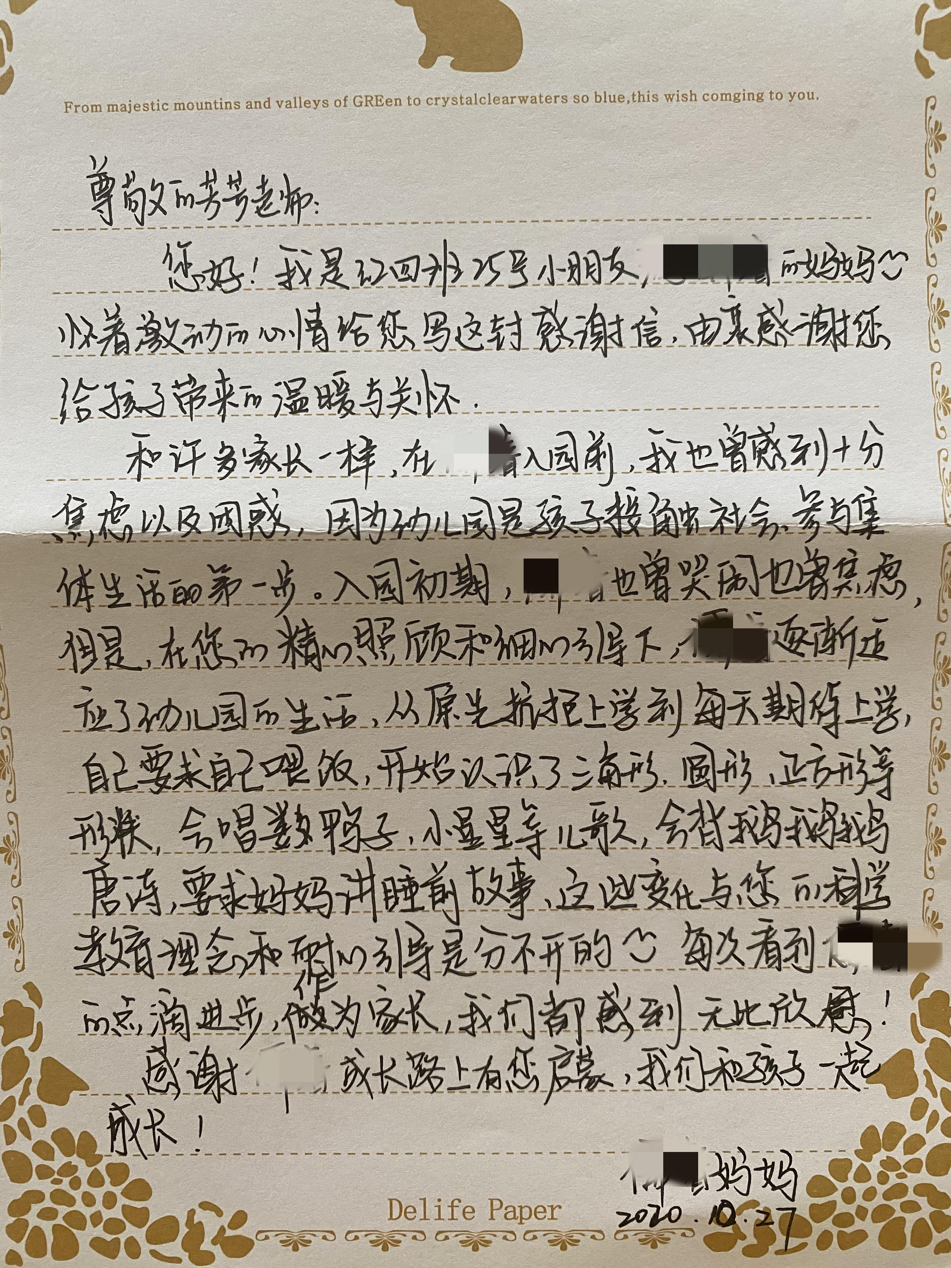 (这是刚刚进入小班的一位妈妈的来信,从字里行间可以看到,妈妈从最初的分离焦虑到后来的欣慰与感谢。陪伴孩子和家长一起成长,芳芳老师的美好愿望正在实现。)