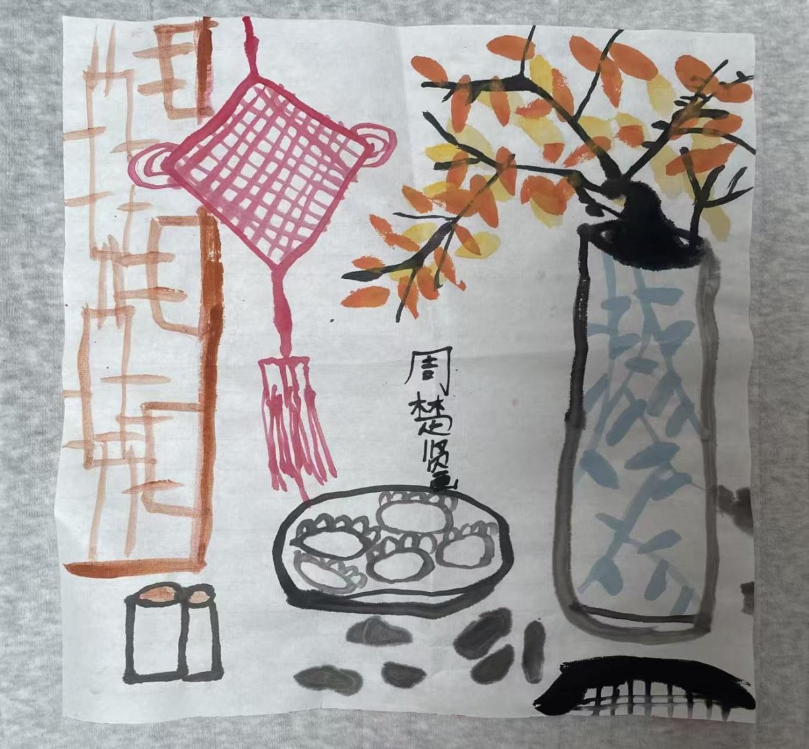 看到孩子笔下的窗棂、中国结、花瓶与饺子,满是生活的温煦与对家的眷恋。我深知 “家是最小国”,家风便是我们行走职场的底气。画中水墨清雅的色调,恰如我们倡导的 “清白做人”—— 中国结寓意联结与坚守,象征着家风的纽带;窗前常青枝代表家风的长青;盘中热气腾腾的饺子,则是我们对 “勤俭持家、清白传家” 最朴素的注脚。我常告诫孩子,无论未来走多远,都要像这画中的景致一般,内心澄澈,行事方正。愿这份童真里的清廉初心,能伴随他成长,成为我们家最珍贵的传家之宝。