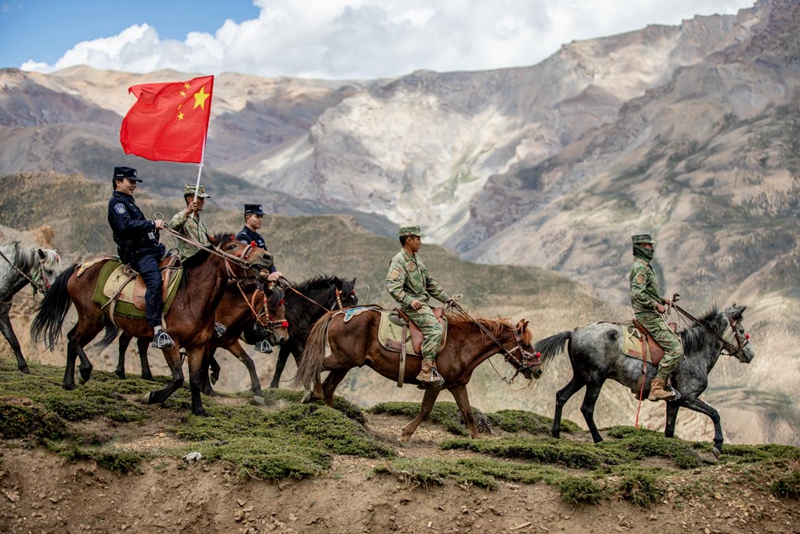 更艰险的巡边路,隐没在海拔5000米的峭壁之上。民警、战士与村民骑着马,在绝壁间逶迤前行,落石与暗冰随时可能出现。次仁多布杰轻抚马鬃,声音如雪山般沉稳:“我父亲的父亲的父亲就在这里出生,这里必须有人守。我住,我的孩子也要住!若无人守边,何人护国?”作为受人尊敬的村医,他本可退休进城,安享优渥。但他依然选择守护这片土地。