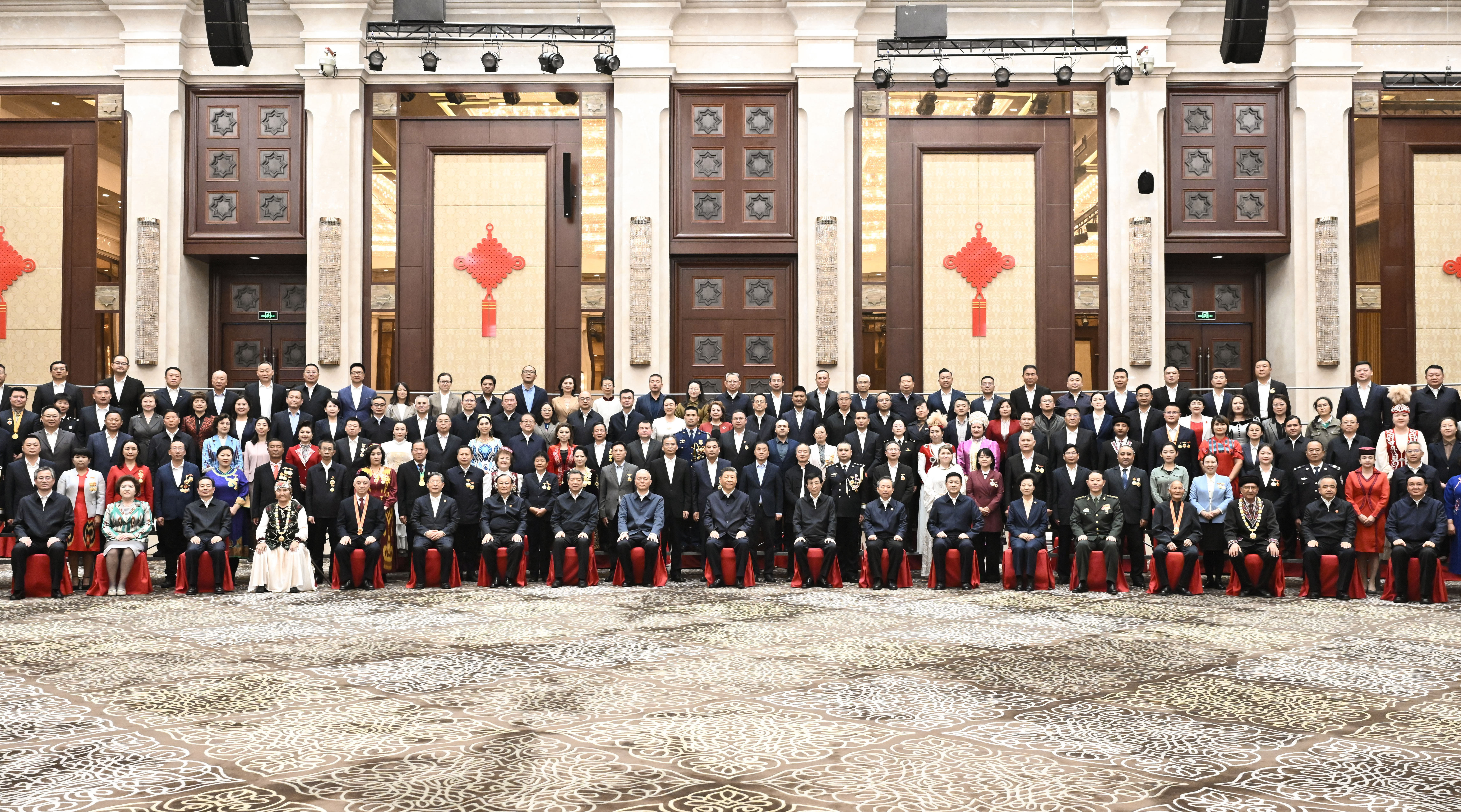 代表中,“七一勋章”获得者魏德友和买买提江·吾买尔、“人民卫士”巴依卡·凯力迪别克、“人民楷模”布茹玛汗·毛勒朵站在第一排。胸前的勋章光灿灿、沉甸甸。