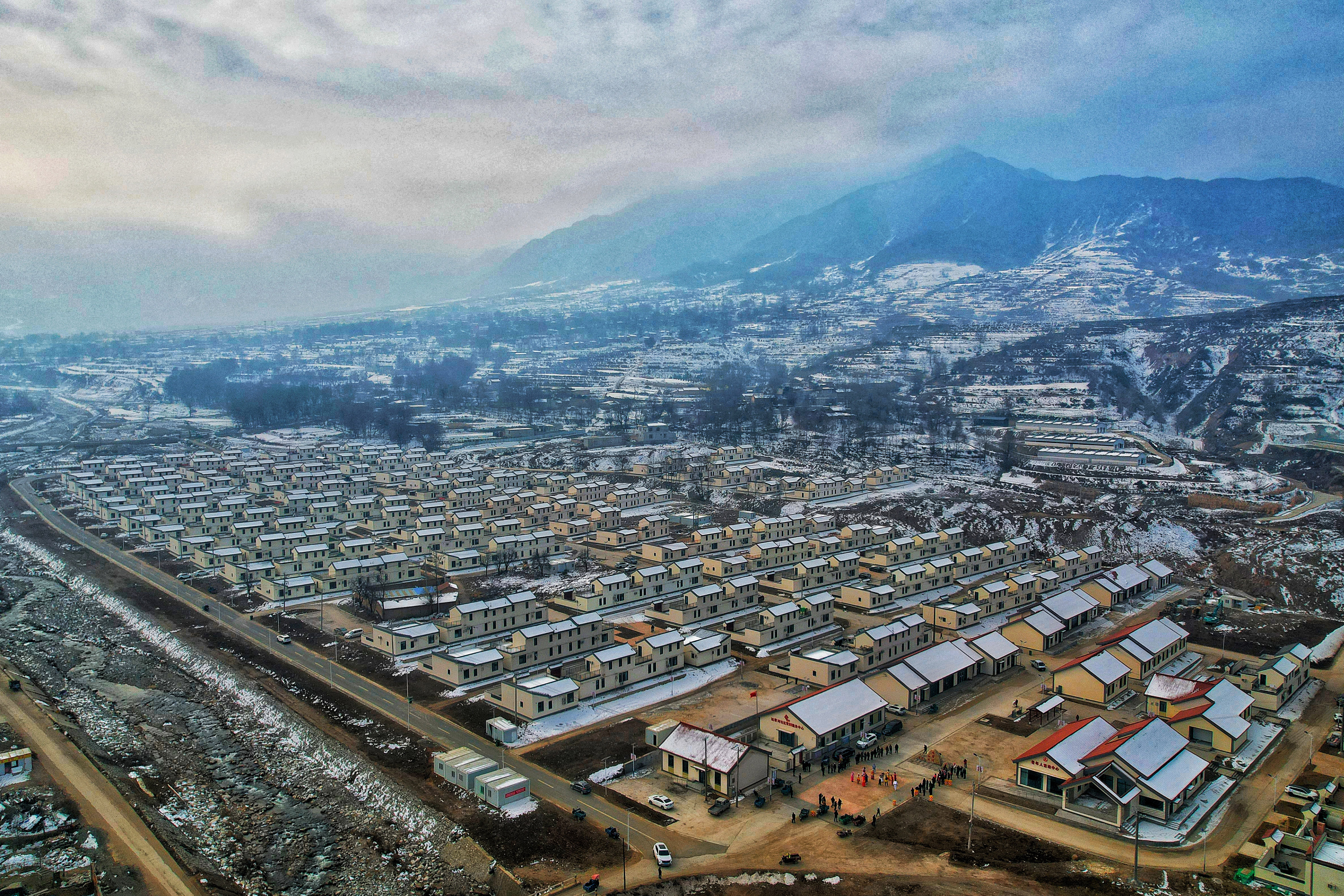 这是甘肃省临夏回族自治州积石山县刘集乡刘集村集中安置点(2024年12月6日摄,无人机照片)。新华社发(张维吉 摄)