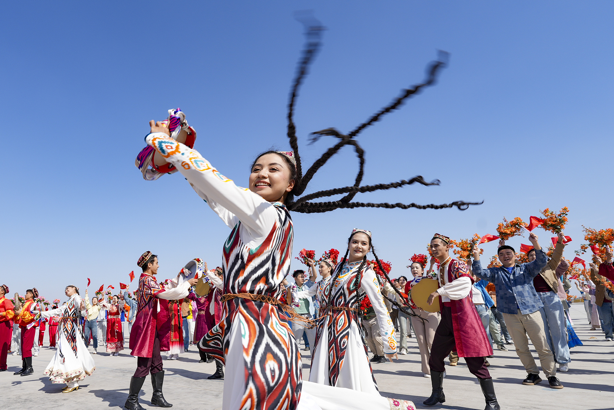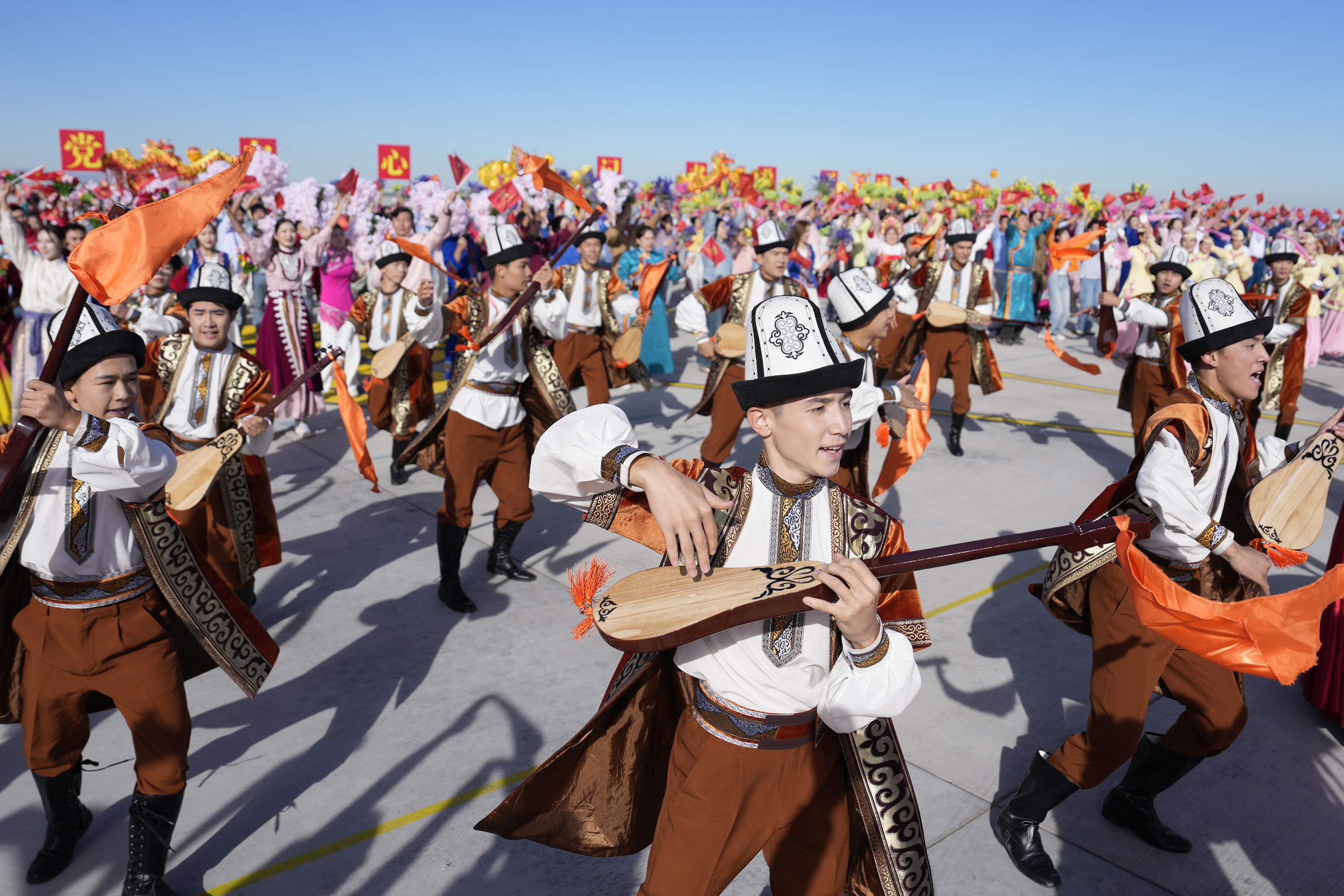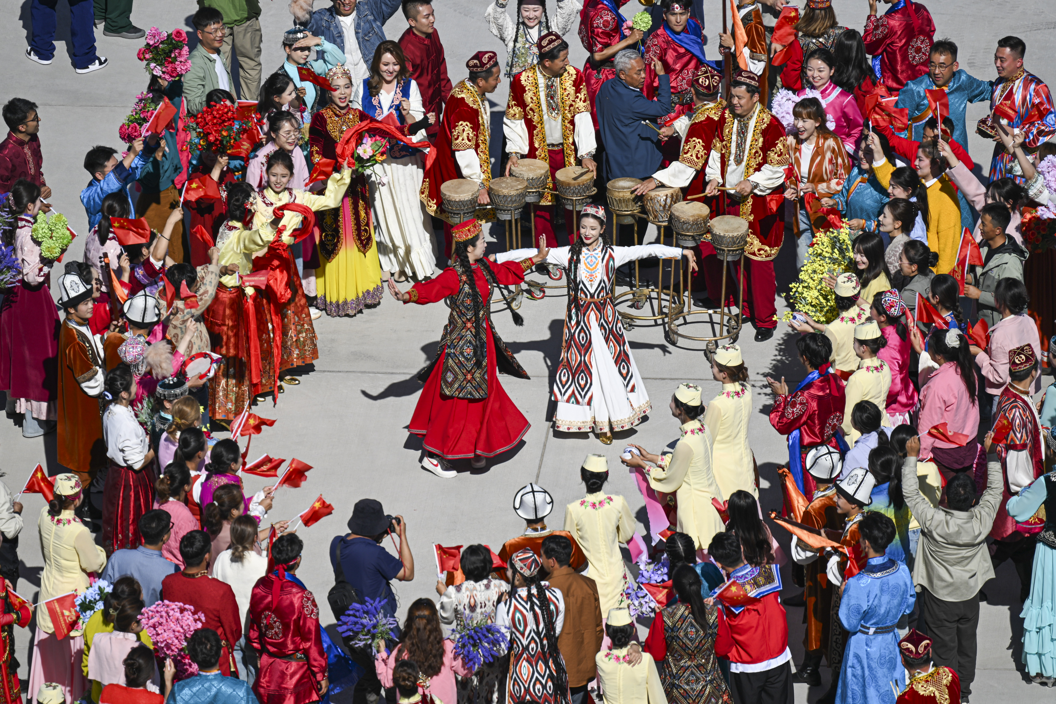 新华社记者的镜头里,各族儿女簇拥在一起,欢笑在一起;明艳的服饰、热烈的歌舞,无不展现出团结与奋进的力量。