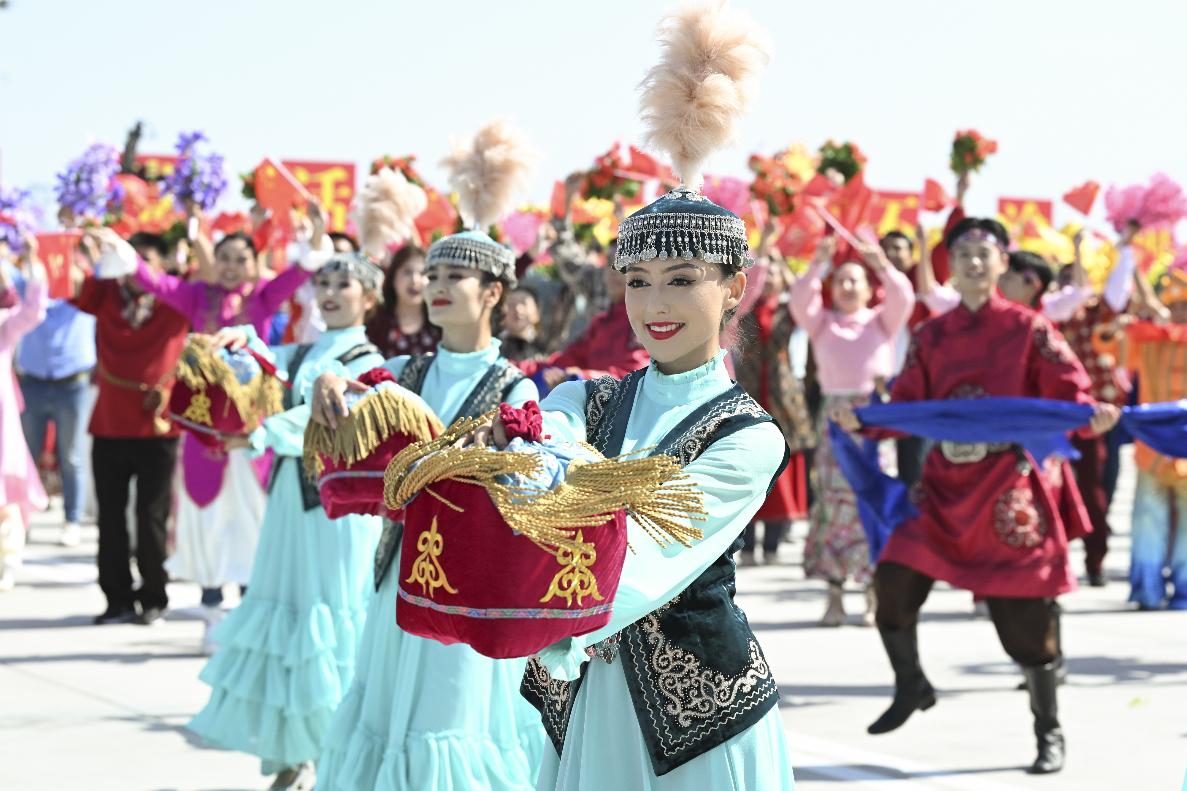 各族群众代表身着民族服饰,载歌载舞,欢迎习近平总书记的到来,表达对总书记的衷心祝福。