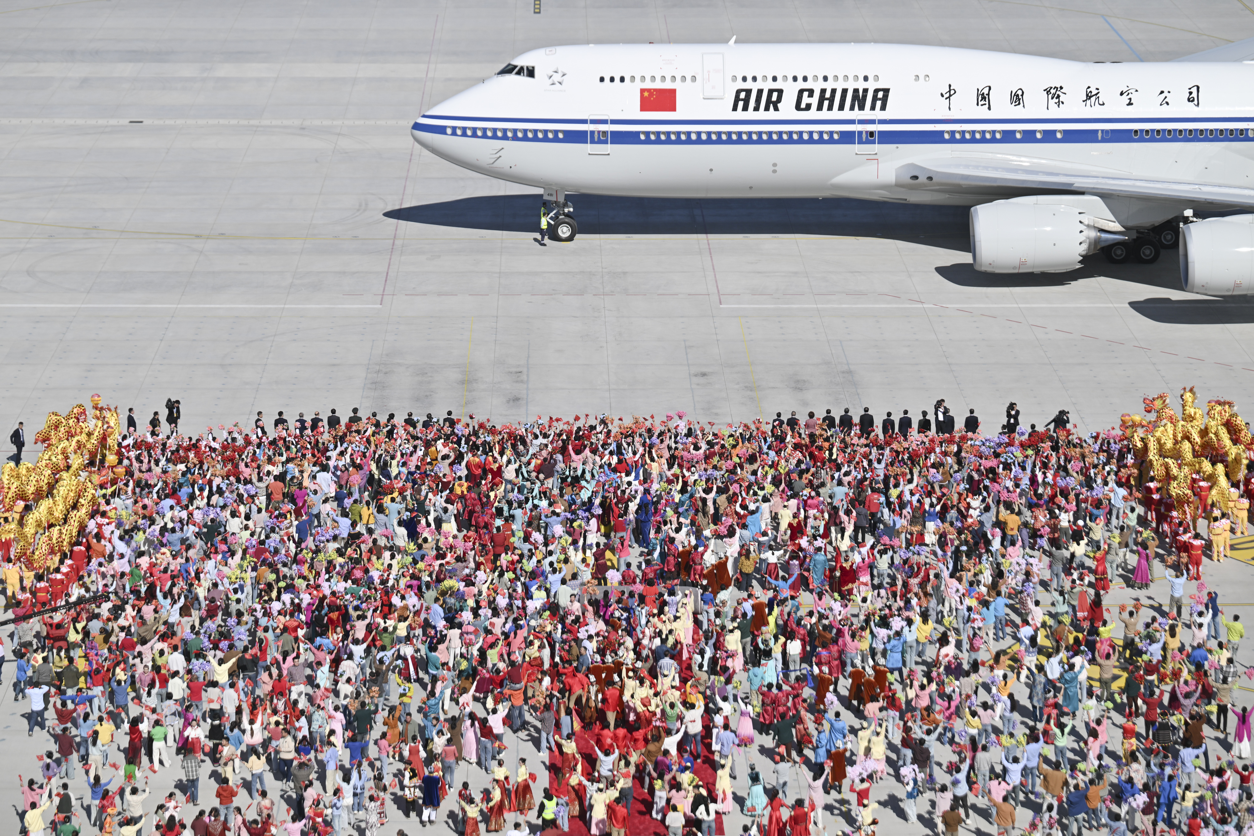 23日14时20分许,习近平总书记乘坐的专机在天山国际机场降落,等候在停机坪的新疆各族各界群众热烈欢呼。习近平总书记走出舱门,向欢迎群众挥手致意。习近平总书记走下舷梯时,少先队员献上鲜花。