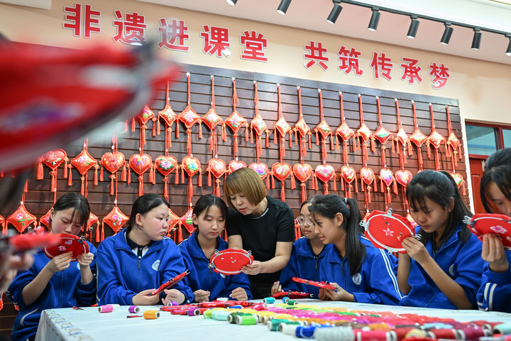 2025年9月26日,内蒙古兴安盟科右中旗巴彦呼舒第六中学美术教师、非遗代表性传承人吴斯琴(左四)指导学生刺绣。近年来,内蒙古兴安盟科尔沁右翼中旗巴彦呼舒第六中学将当地国家级非遗图什业图刺绣引入校园,开设校本课程,并成立兴趣社团,在丰富校园文化生活的同时,让学生们近距离感受非遗的魅力,弘扬和传承中华优秀传统文化。