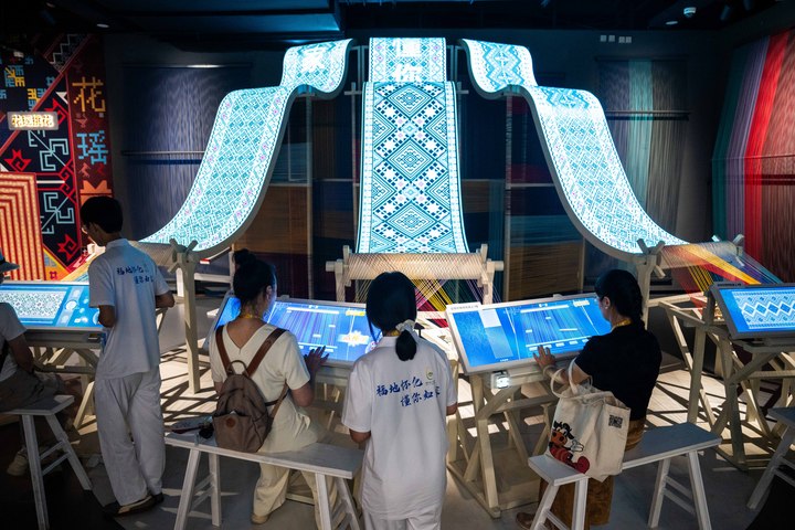 2025年9月16日,游客在湖南省怀化市五溪非遗园体验数字化织锦。五溪非遗园位于湖南省怀化市鹤城区,于2025年5月正式开园。园区包含非遗广场、数字体验空间和研学工坊三大板块,运用VR、AR、全息投影等技术打造42个沉浸式非遗体验项目,吸引更多人了解、学习非遗,让传统技艺成为城市发展的文化动力。