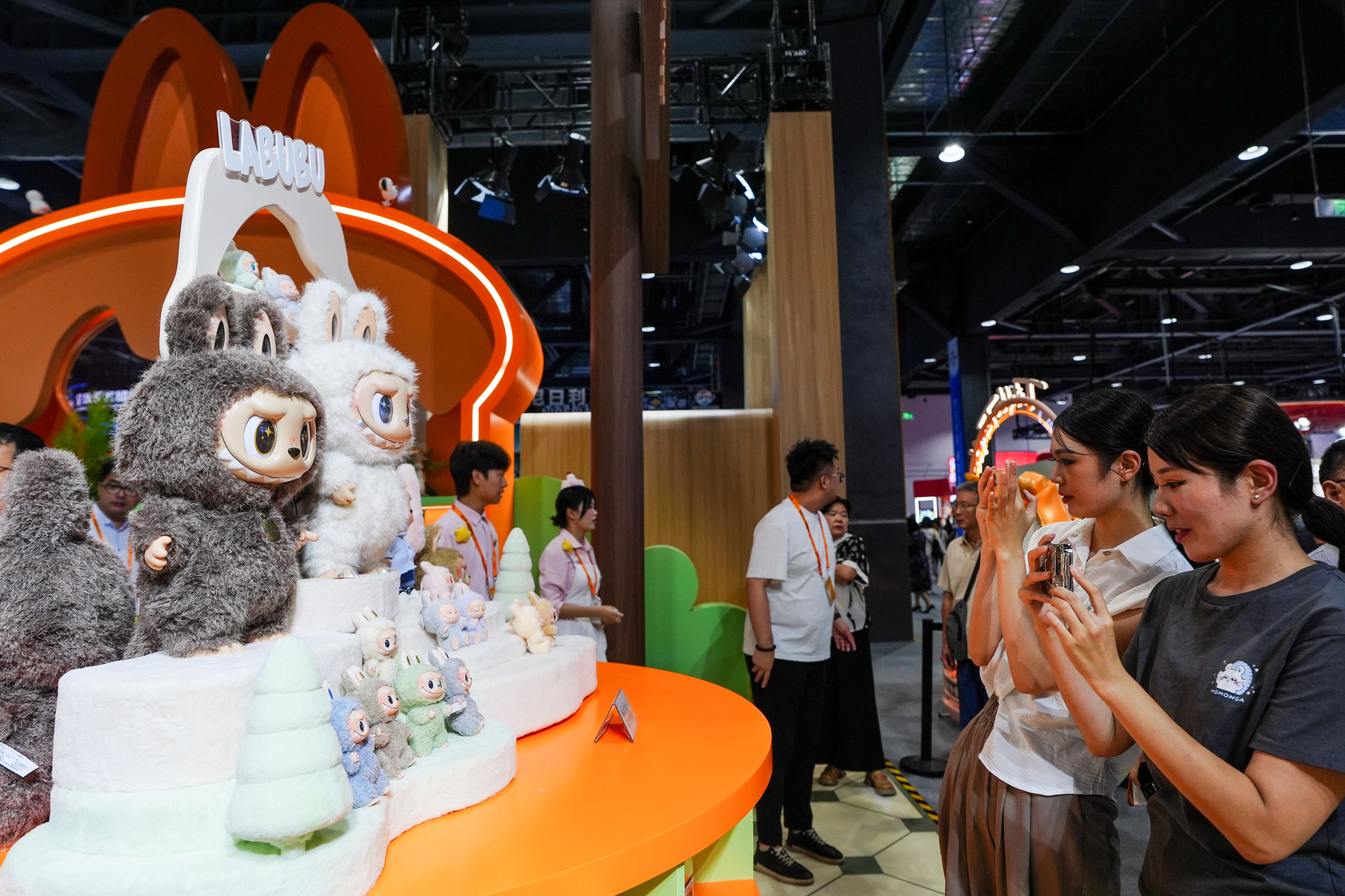 2025年9月12日,参观者在2025服贸会主题展展区泡泡玛特展位拍摄LABUBU玩偶。近年来,以潮玩为代表的中国创意产业正通过创新的设计理念与商业模式驱动,在全球掀起热潮。这些可爱玩偶满足了人们“精神消费”和“情绪消费”需求,带来富有趣味性的体验,成为消费者追捧的对象。以泡泡玛特为代表的中国潮玩产业,产业规模从2015年的63亿元飙升至2023年的600亿元,增长近10倍。
