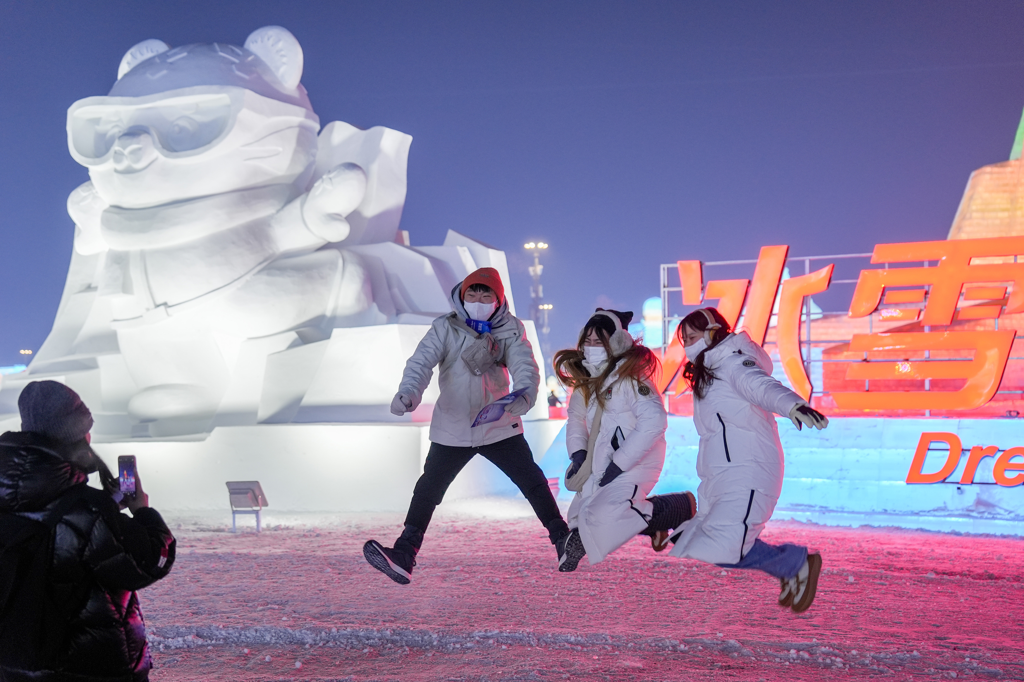 2024年12月20日,两岸青年游客在哈尔滨一冰雪景区内拍照留影。