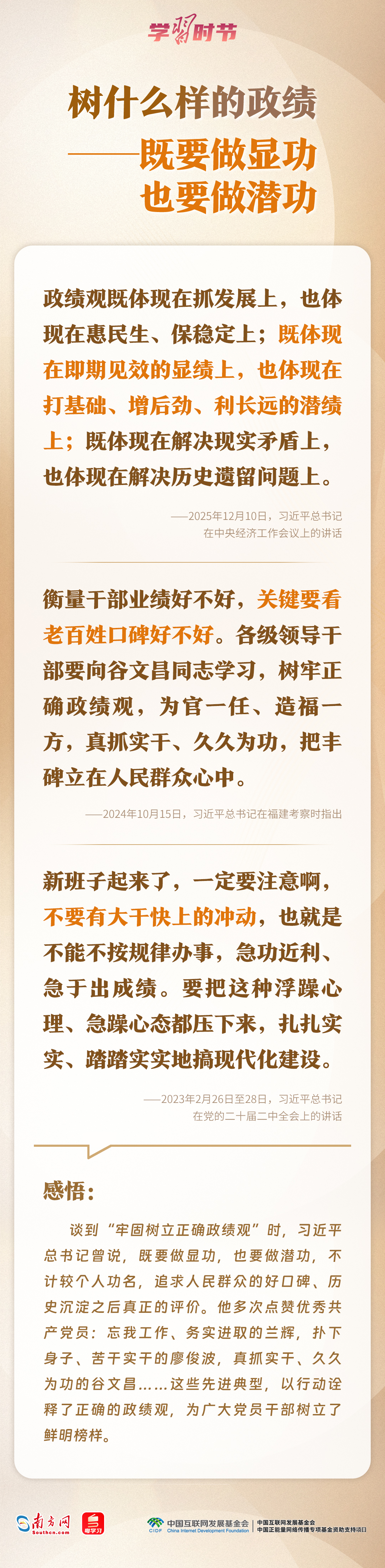 今年是“十五五”开局之年,如何确保开好局、起好步?近日,习近平总书记在省部级主要领导干部学习贯彻党的二十届四中全会精神专题研讨班开班式上这样强调,要树立和践行正确政绩观,坚持从实际出发、按规律办事,自觉为人民出政绩、以实干出政绩。