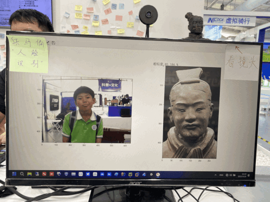 兵马俑“人脸识别”、虚拟划船、桌上冰壶都化为孩子们可以互动体验的小游戏(未来网瞿凯侠 摄)