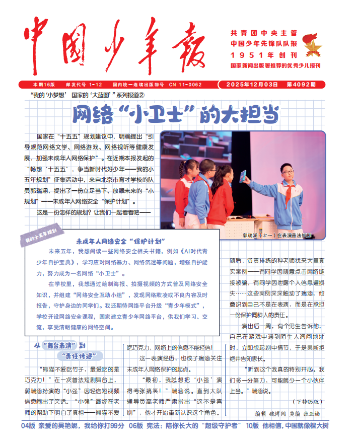 在近期本报发起的畅想“十五五,争当新时代好少年——我的小五年规划”征集活动中,来自北京市育才学校的队员郭瑞涵,提出了一份立足当下、放眼未来的“小规划”——未成年人网络安全“保护计划”。这是一份怎样的规划?快翻开报纸解锁吧!