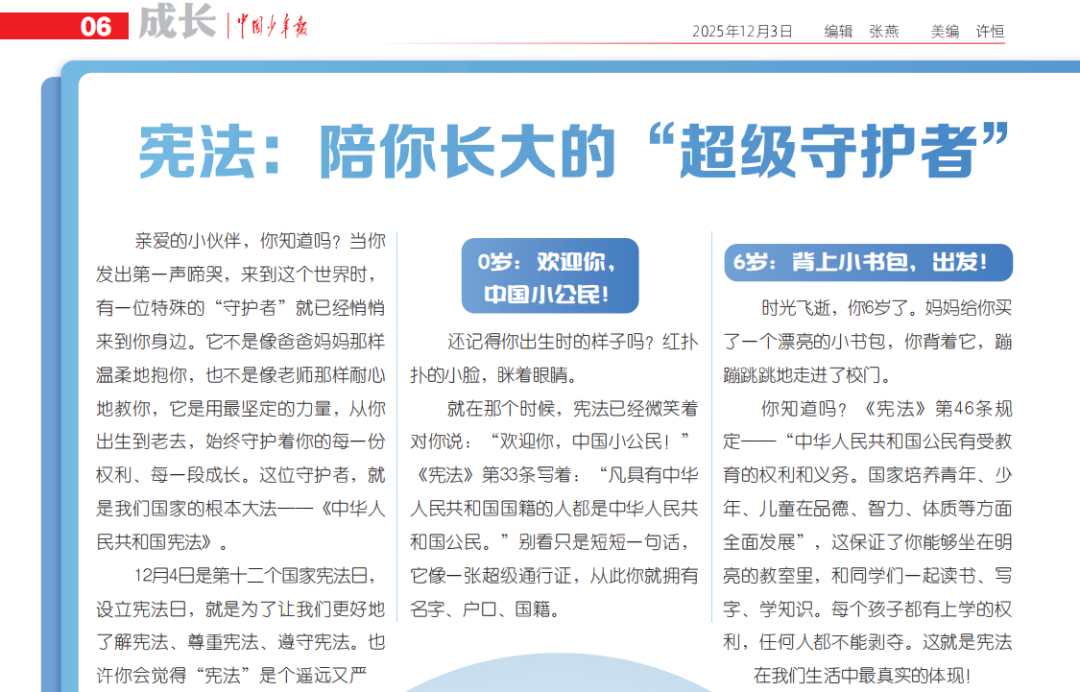 亲爱的小伙伴,你知道吗?当你发出第一声啼哭,来到这个世界时,有一位特殊的“守护者”就已经悄悄来到你身边。它不是像爸爸妈妈那样温柔地抱你,也不是像老师那样耐心地教你,它是用最坚定的力量,从你出生到老去,始终守护着你的每一份权利、每一段成长。这位守护者,就是我们国家的根本大法--《中华人民共和国宪法》