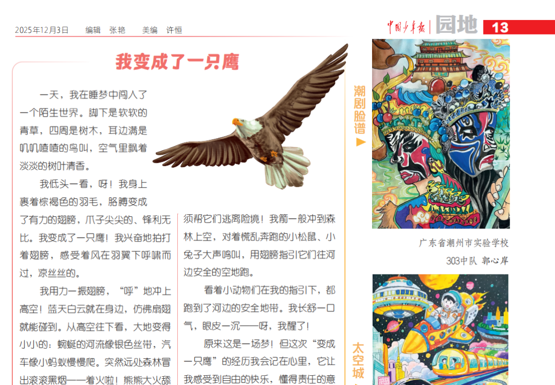 有梦中化鹰守护同伴的奇幻成长故事,有潮州脸谱里绘就的潮剧文化韵味;有太空城堡中畅想的航天妙思,有丑橘写生里藏着的生活意趣——快翻开报纸,见证小作者们用文字与画笔迸发的璀璨光芒!