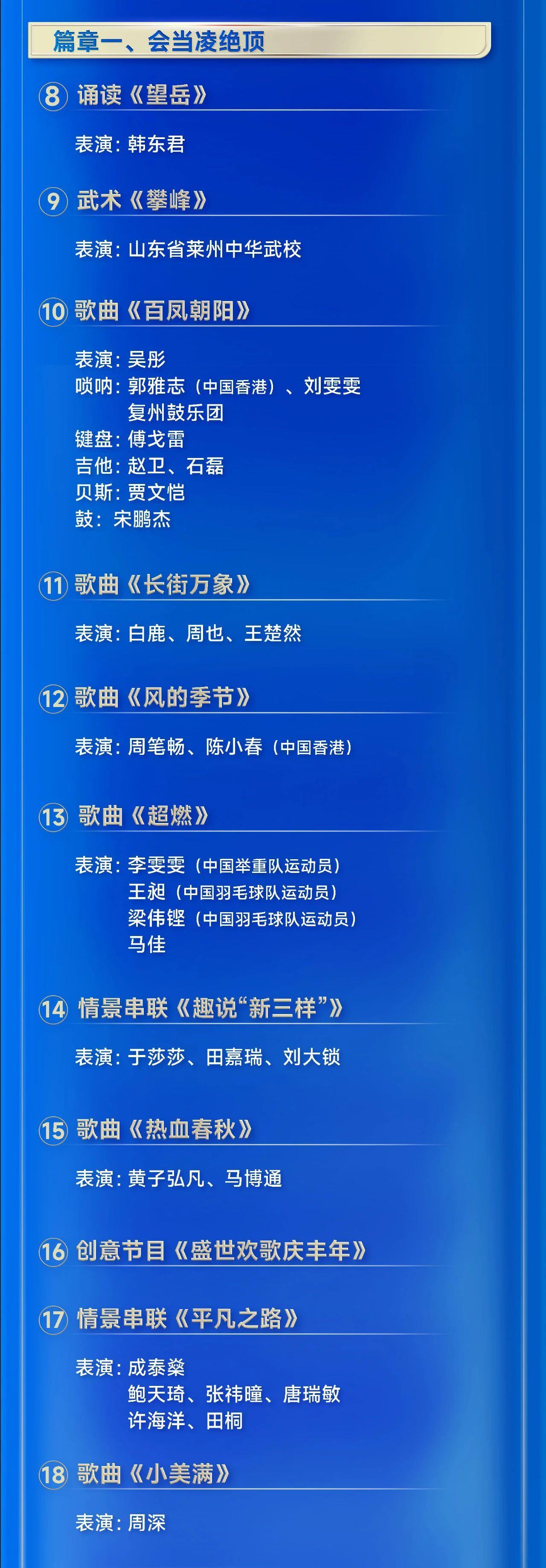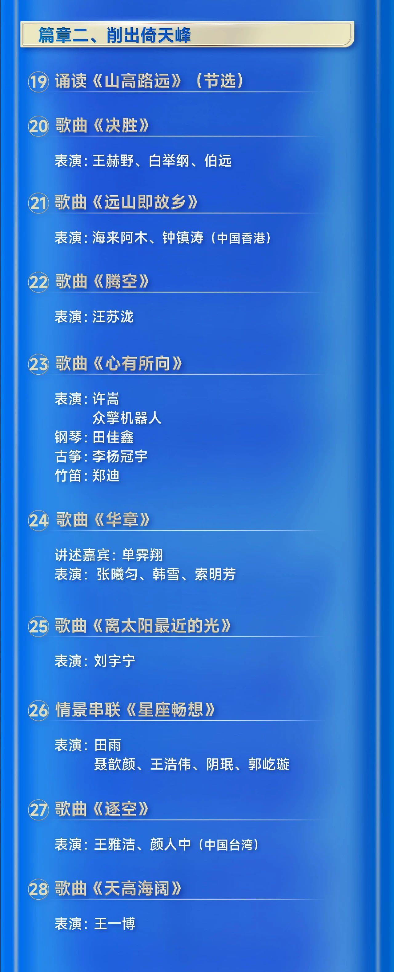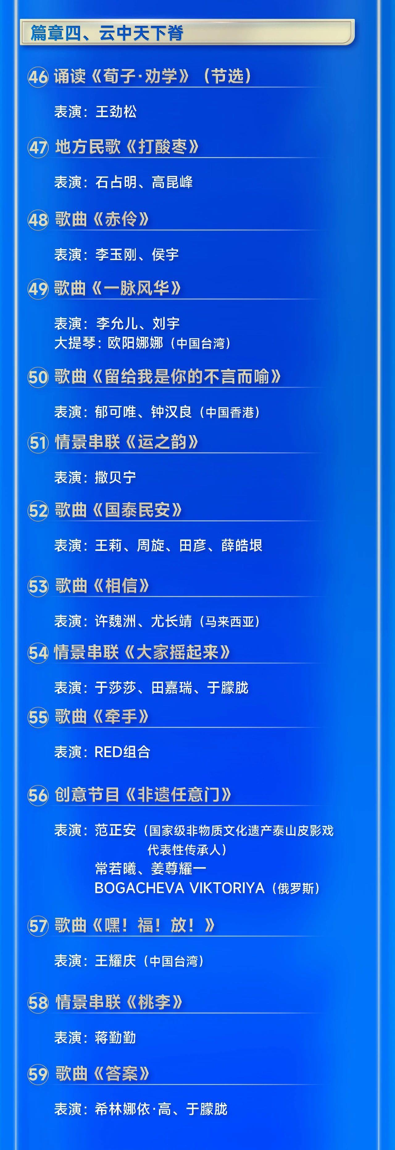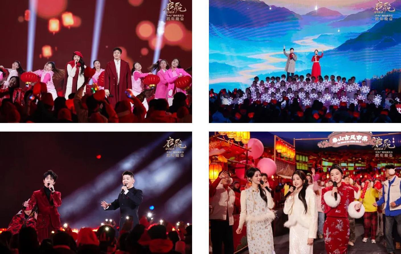 晚会由总台主持人任鲁豫、朱迅、撒贝宁、马凡舒主持。开场节目《直下看山河》取景自金山岭长城,融合民乐、戏曲、武术、艺术体操、跑酷等多种艺术形式,生动展现锦绣山河中国色的壮美;歌舞《灯火年年》的非遗打铁花表演犹如新年烟火划亮夜空,点燃奔向美好明天的激情;新创作歌曲《热血春秋》曲调昂扬,气氛热烈;原创歌曲《长街万象》置身于集市之间,为受众呈现了一幅充满生活气息的市井画卷。