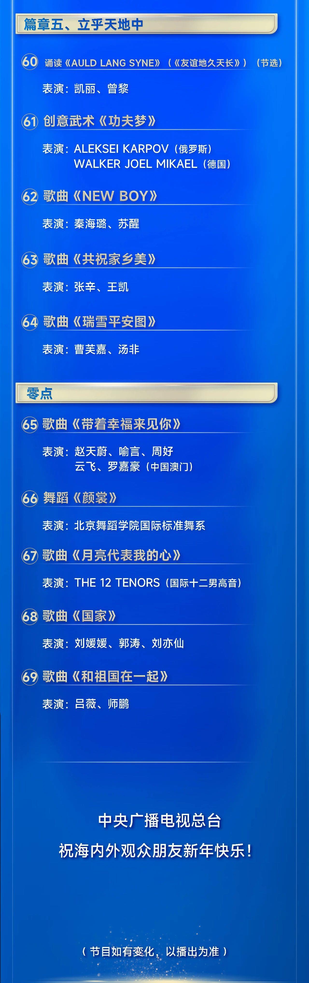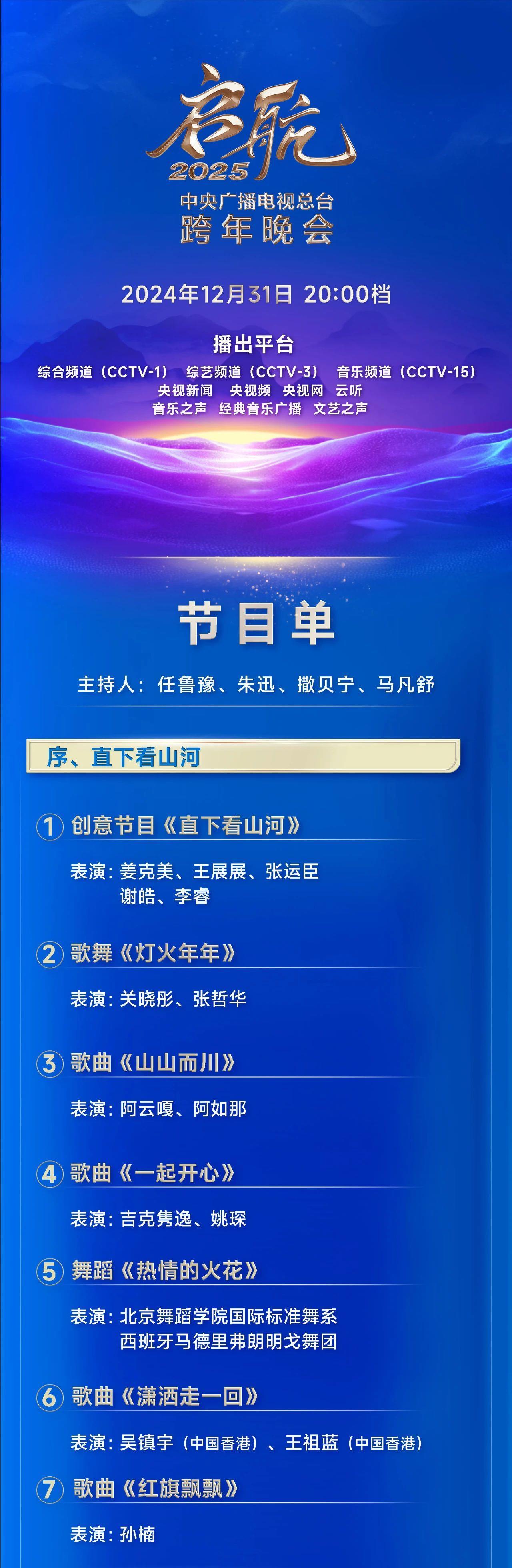 岁序更替,璀璨启航!《启航2025——中央广播电视总台跨年晚会》将于今天20:00档,在央视综合频道(CCTV-1)、综艺频道(CCTV-3)、音乐频道(CCTV-15),央视新闻、央视频、央视网、云听客户端,以及音乐之声、经典音乐广播、文艺之声等平台与广大受众见面。