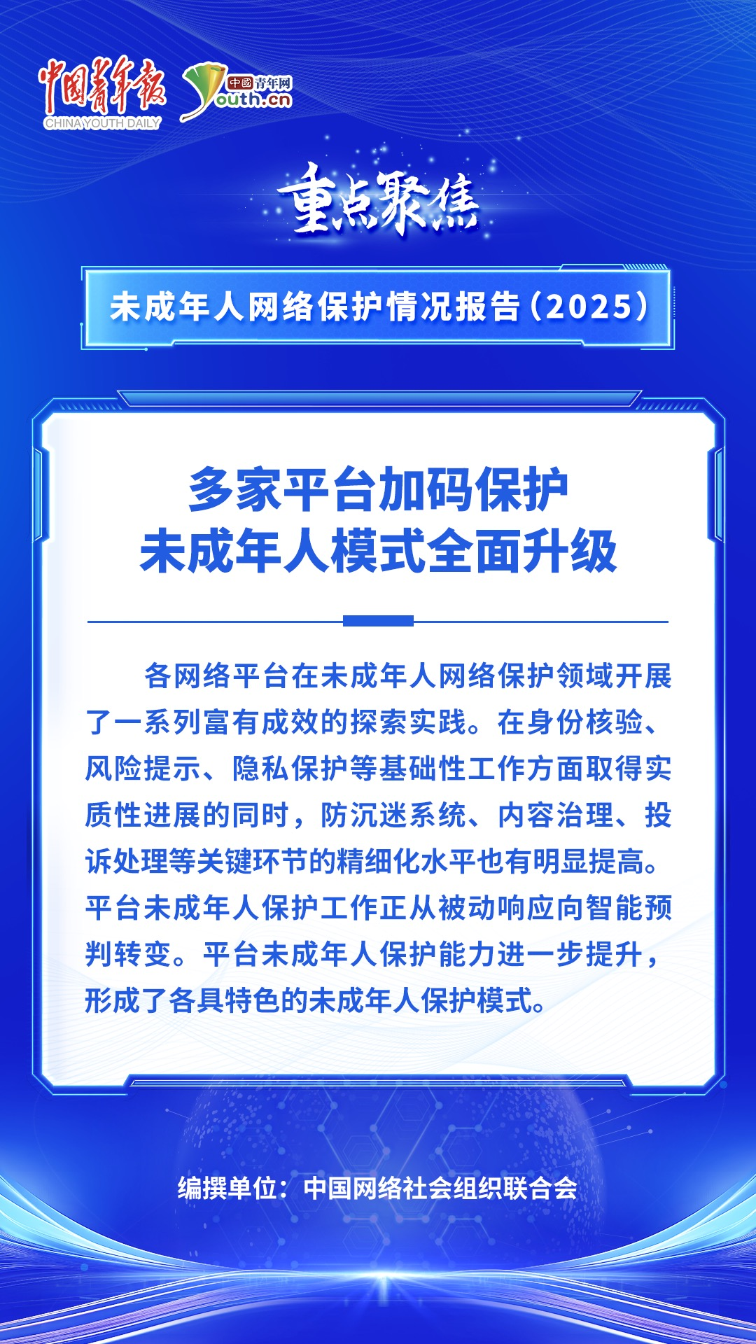 织密未成年人网络安全网,《未成年人网络保护情况报告(2025)》显示,多家平台加码保护,未成年人模式全面升级。各大平台从“要我做”变为“我要做”,纷纷扛起社会责任,共同为青少年构建了一个更清朗、更安全、更健康的网络空间。
