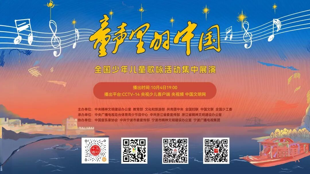 由中央精神文明建设办公室、教育部、文化和旅游部、共青团中央、全国妇联、中国文联、全国少工委联合主办的2025年 “童声里的中国”全国少年儿童歌咏活动集中展演 ,将于10月4日(星期六)19:00在中央广播电视总台央视少儿频道(CCTV-14)正式播出。