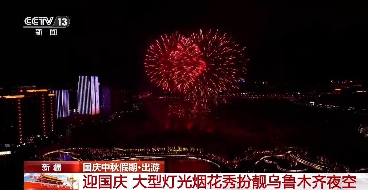 国庆假期,一场以“家国共此时 光焰耀天山”为主题的大型灯光烟花秀在新疆乌鲁木齐市上演,数万名群众在震撼人心的光影盛宴中,共同祝愿伟大的祖国繁荣富强。