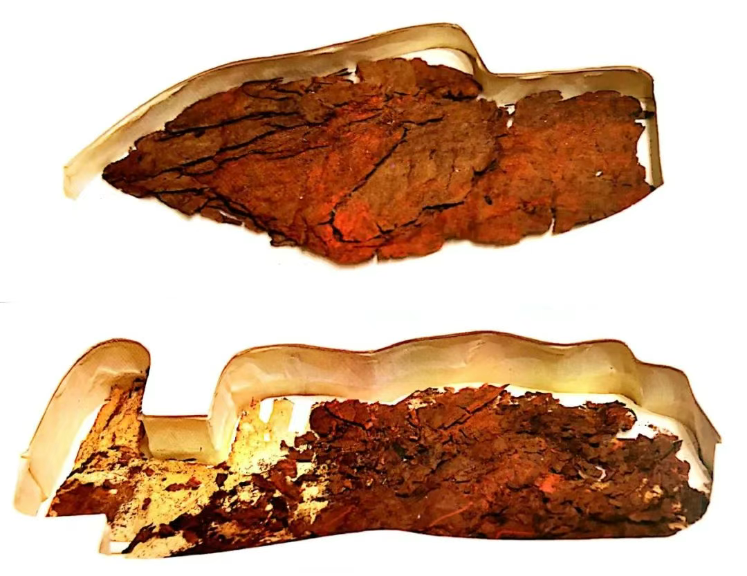 △ 未完全剥离的帛书残片。目前,湖南省博物馆已完成全部帛书的标准化影像采集,并通过760纳米的近红外成像,在其中一片未完全剥离的帛书上发现肉眼不可见的墨迹字样40余个。