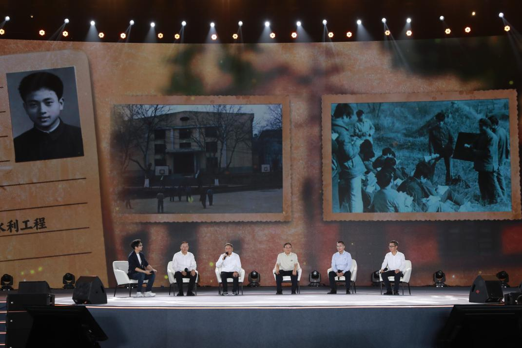 多名红旗渠修渠人及其后代现场讲述(从右往左分别为:红旗渠景区演员、除险队长任羊成外孙任斌强;红旗渠支渠配套建设模范、铁姑娘队队长郭秋英;红旗渠建设特等模范、烈士张运仁之子张买江;红旗渠灌区服务中心合涧渠管所所长、烈士张运仁之孙张学义;红旗渠干部学院教师、林县原县长李贵曾孙女李媛)。主办方供图