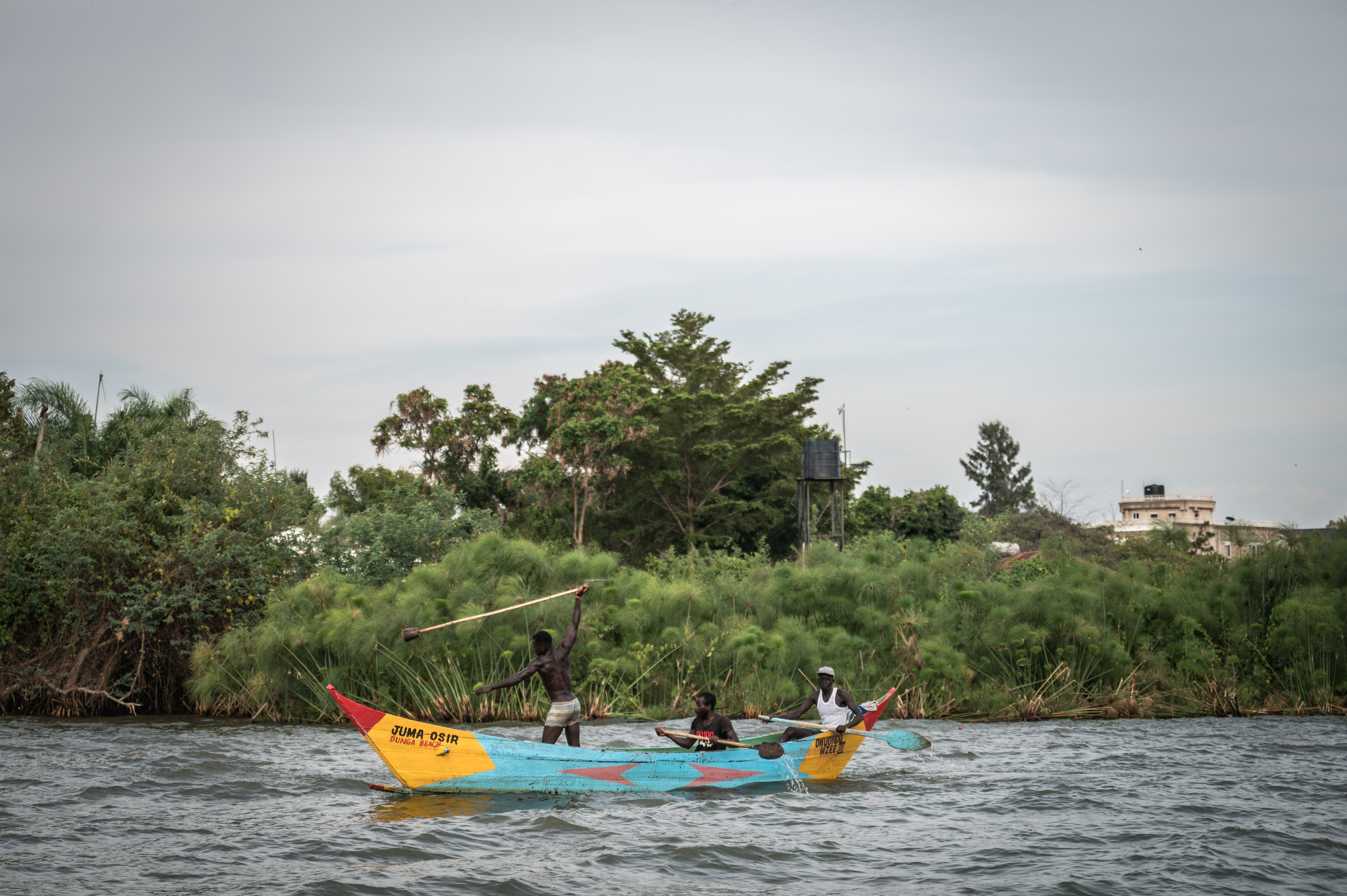 2025年4月3日,在肯尼亚基苏木,渔民在维多利亚湖中捕鱼。新华社记者 王冠森 摄