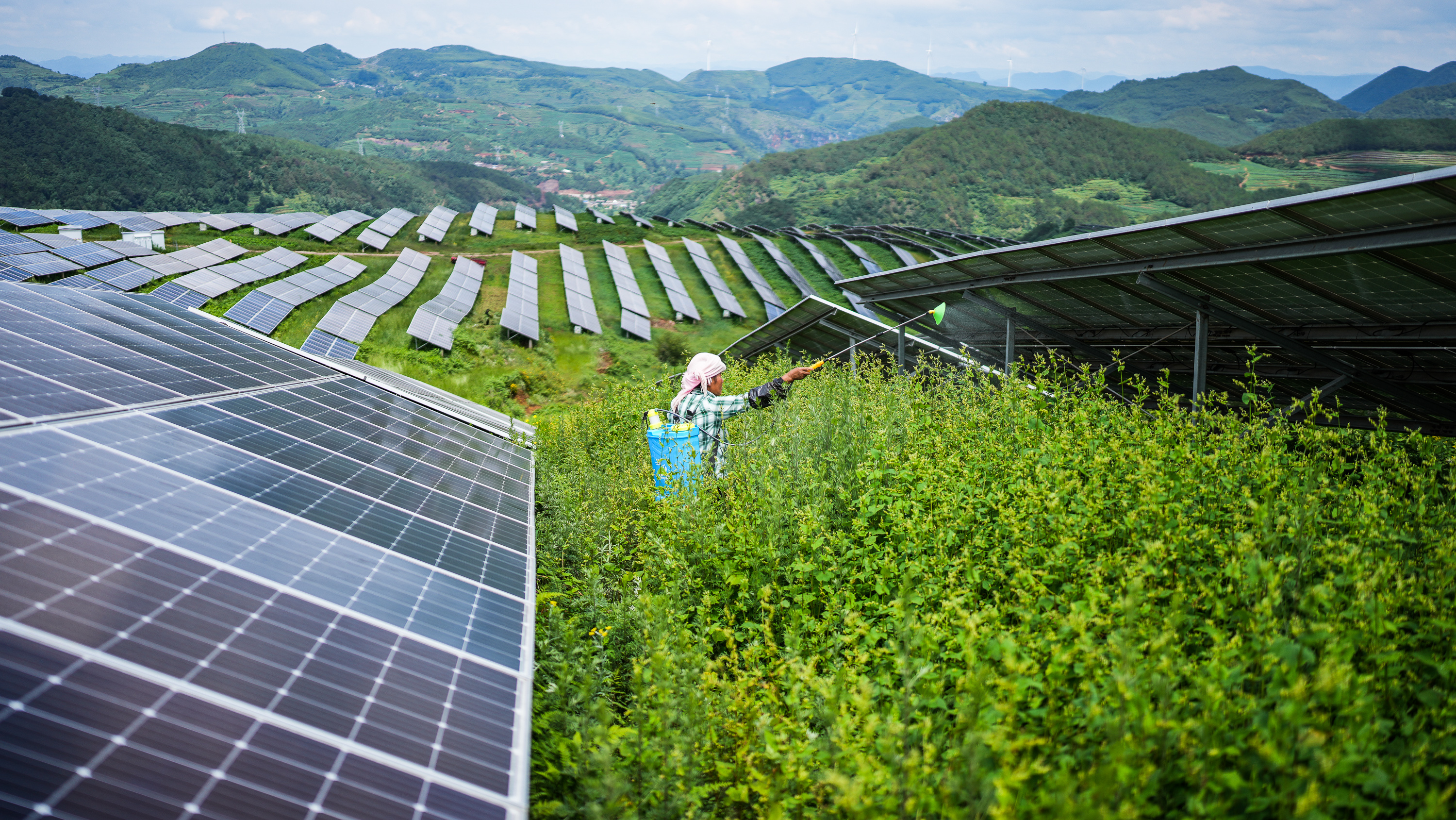 2025年7月3日,当地村民在贵州金元么站农业光伏电站光伏板间的土地上劳作。新华社记者 陶亮 摄