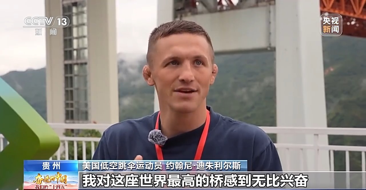 美国低空跳伞运动员 约翰尼迪·朱利尔斯:我对这座世界最高的桥感到无比兴奋,我们想用一系列独特的跳伞动作,向世界展示贵州无与伦比的美。