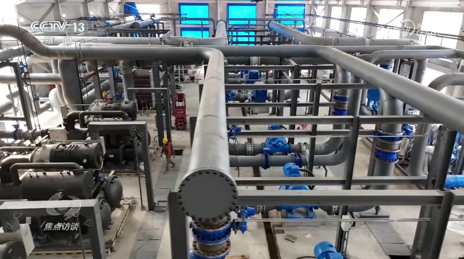 地热能源站是整个清洁热源项目的枢纽。地热水从地下1500米抽上来,要先在地热能源站提取热量,再用这些热量加热自来水,然后把加热好的水通过管道送到居民家实现供暖。往百姓家送水的出水口温度高低,直接决定了居民家里暖不暖。