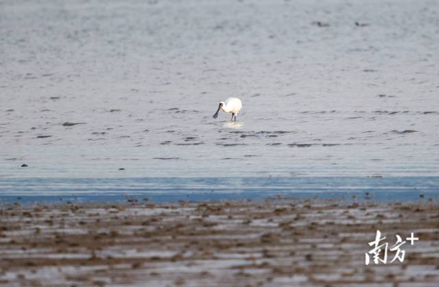深圳湾水域,黑脸琵鹭在海边捕食。 南方+记者 鲁力 摄