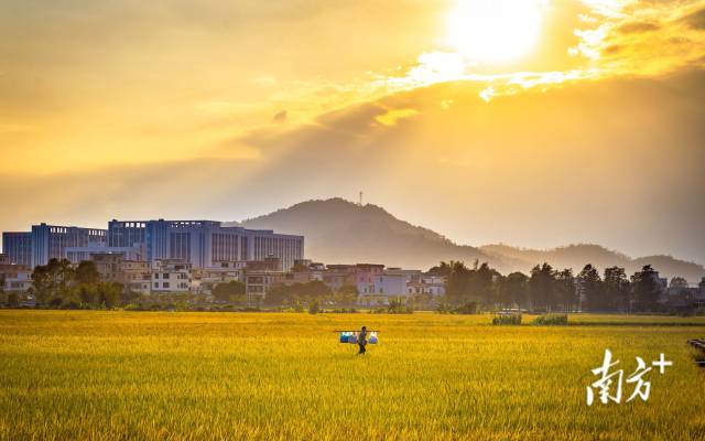 广东珠海市斗门镇小濠冲村。傍晚时分,太阳穿过云层,阳光从云隙中穿透而出照射在稻田上。 南方+拍客 麦志豪 摄