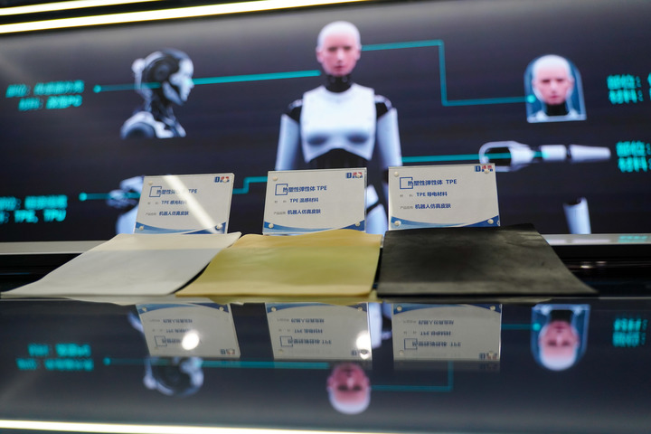 这是在位于龙口市的山东道恩高分子材料股份有限公司新材料展示中心展示的一款用于机器人仿真皮肤的新材料(7月2日摄)。新华社记者 徐速绘 摄
