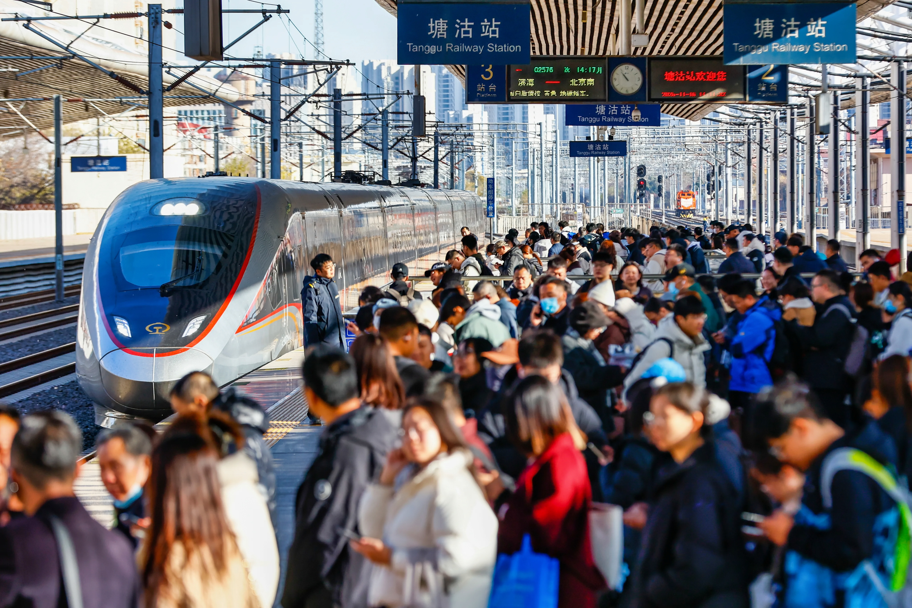 2025年11月16日,旅客在位于天津市滨海新区的塘沽站准备登车。新华社发(杜鹏辉摄)
