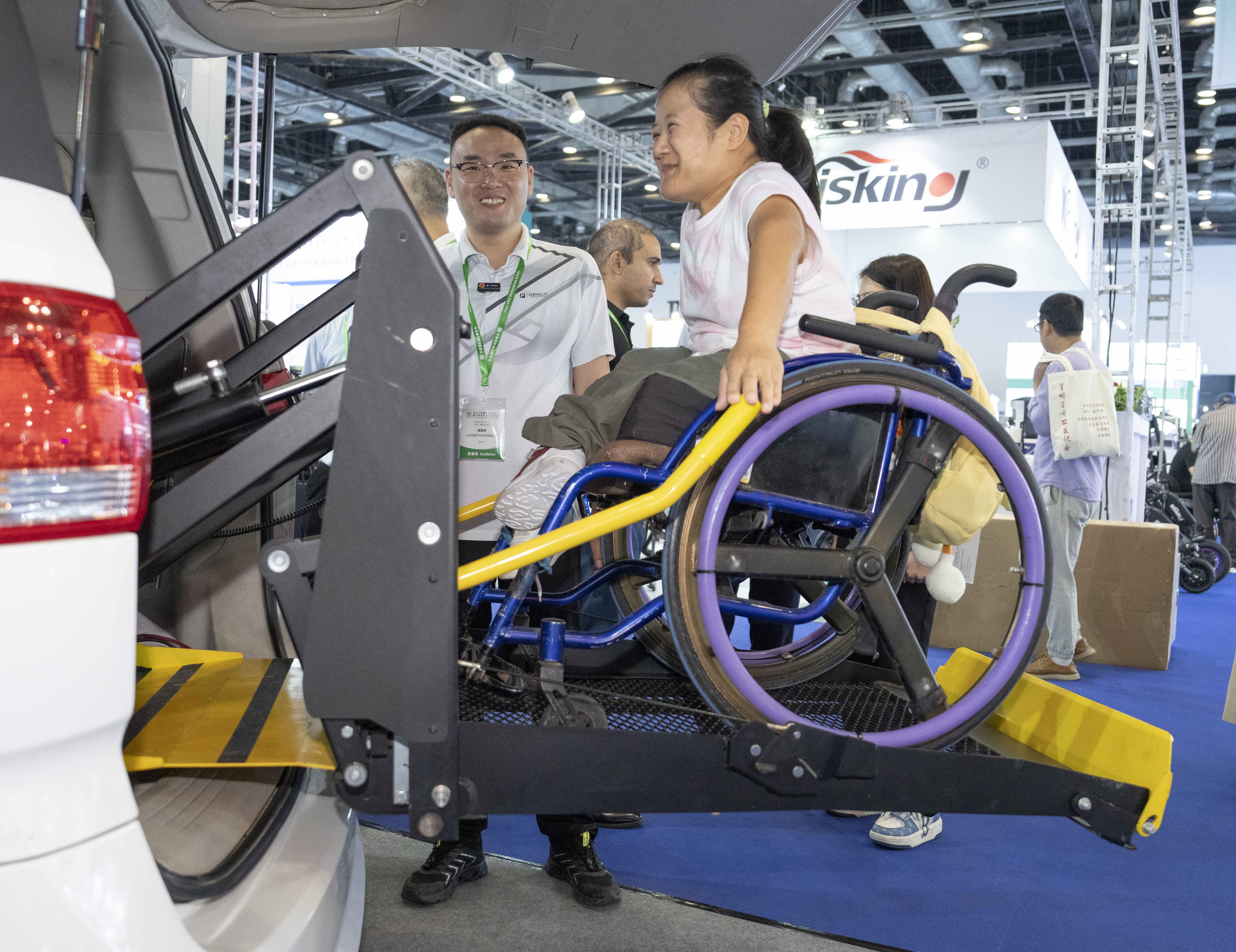 △参观者在2025中国国际福祉博览会暨中国国际康复博览会上体验尾门式升降机