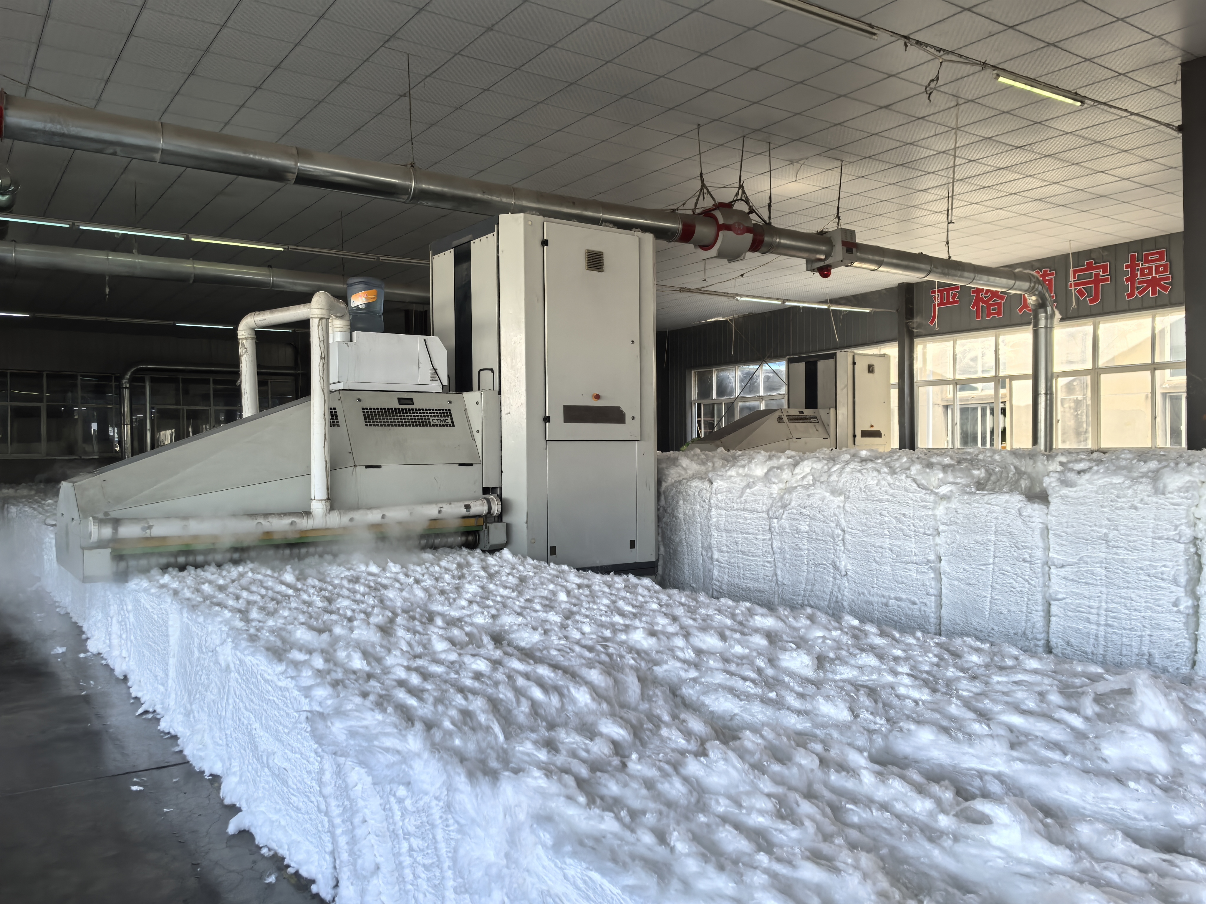 在生产车间,往复式抓棉机正在“吞吐”物料。新华社记者 田中全 摄