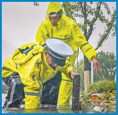 浙江省湖州市长兴县公安局民辅警冒着强降雨疏通排水口。