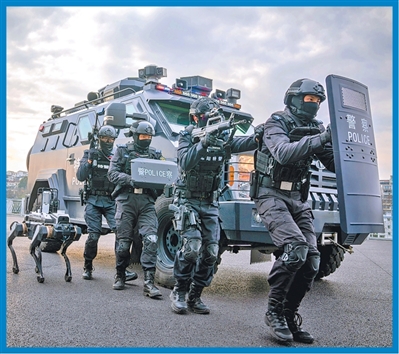 四川省绵阳市公安局特巡警支队特警大队队员与警用机器狗协同配合,开展实战化演练。