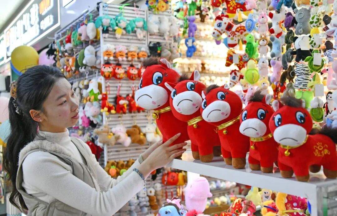随着马年春节临近,一款被称为“哭哭马”的公仔玩具在网络上意外走红,成为浙江义乌市场的爆款产品。(王华斌/人民图片)