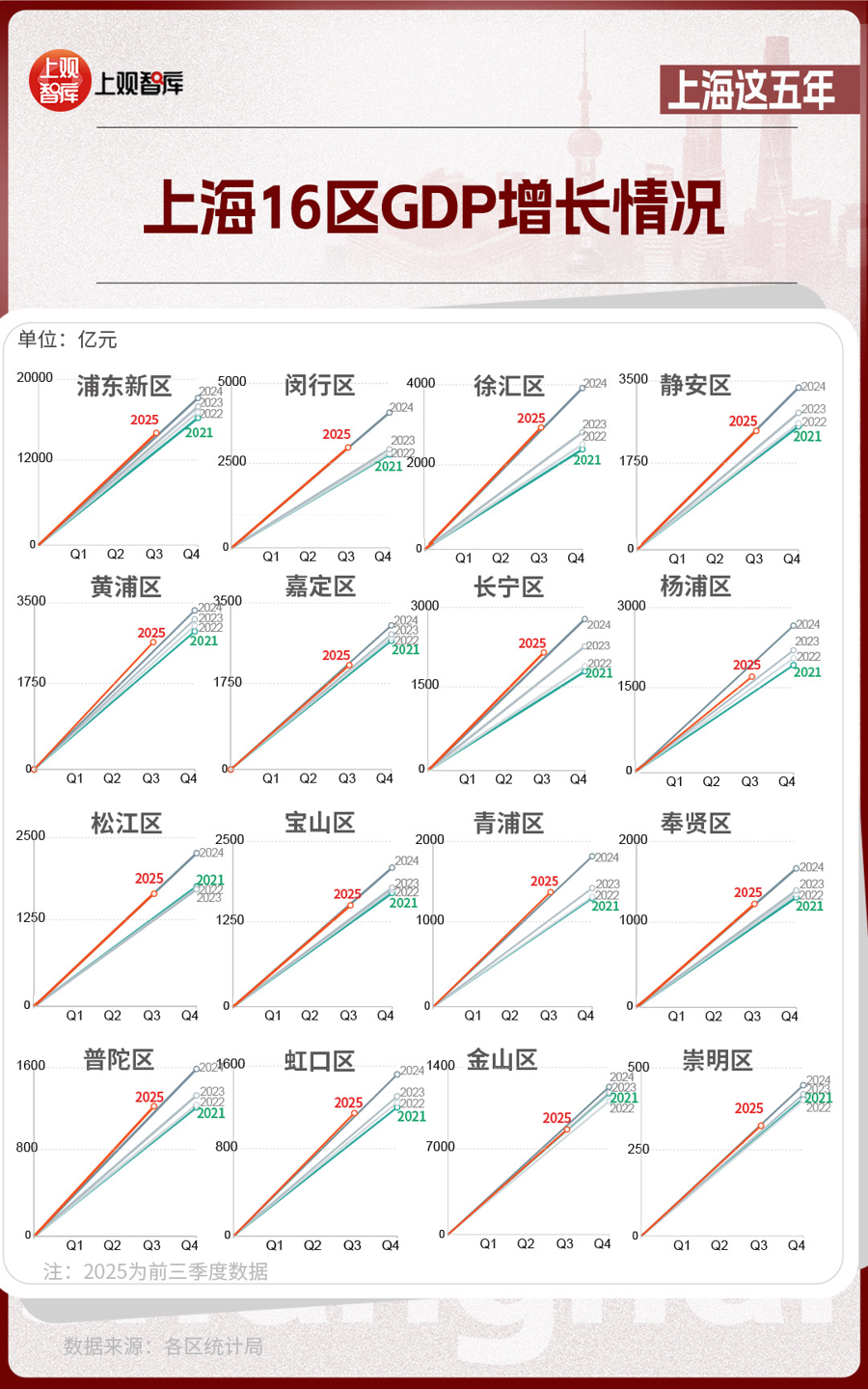 区域层面,上海16区GDP的变化,体现出从中心向多极扩散的趋势。2021年,浦东新区GDP占全市近36%,而到了2025年,这一比重下降至约33%。其他区在这五年间,充分发挥自身优势,齐头并进,为上海发展创造了更多增长极。