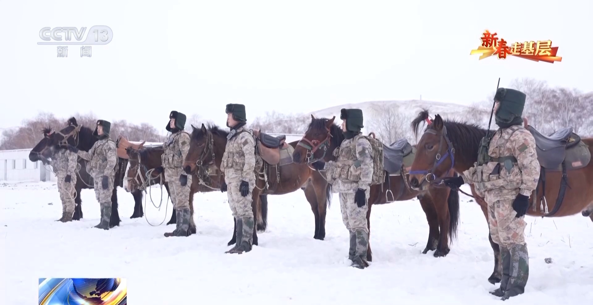 总台央视记者 刘洁:官兵们正在进行骑马巡逻的准备,每匹军马都系上了鲜艳的红头绳,给冬日的边关带来了暖暖的年味。这些军马是官兵们巡逻途中最亲密的战友,今天他们再一次踏上边防巡逻路,用坚守迎接新春。
