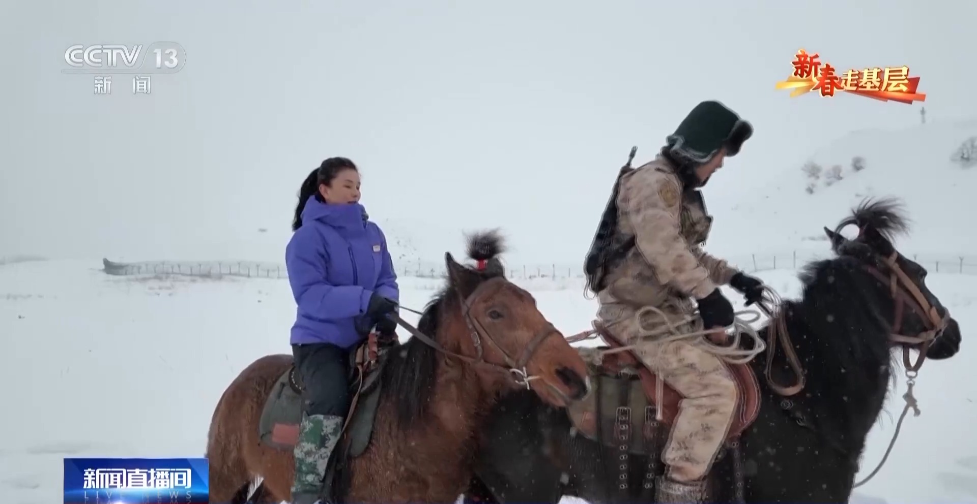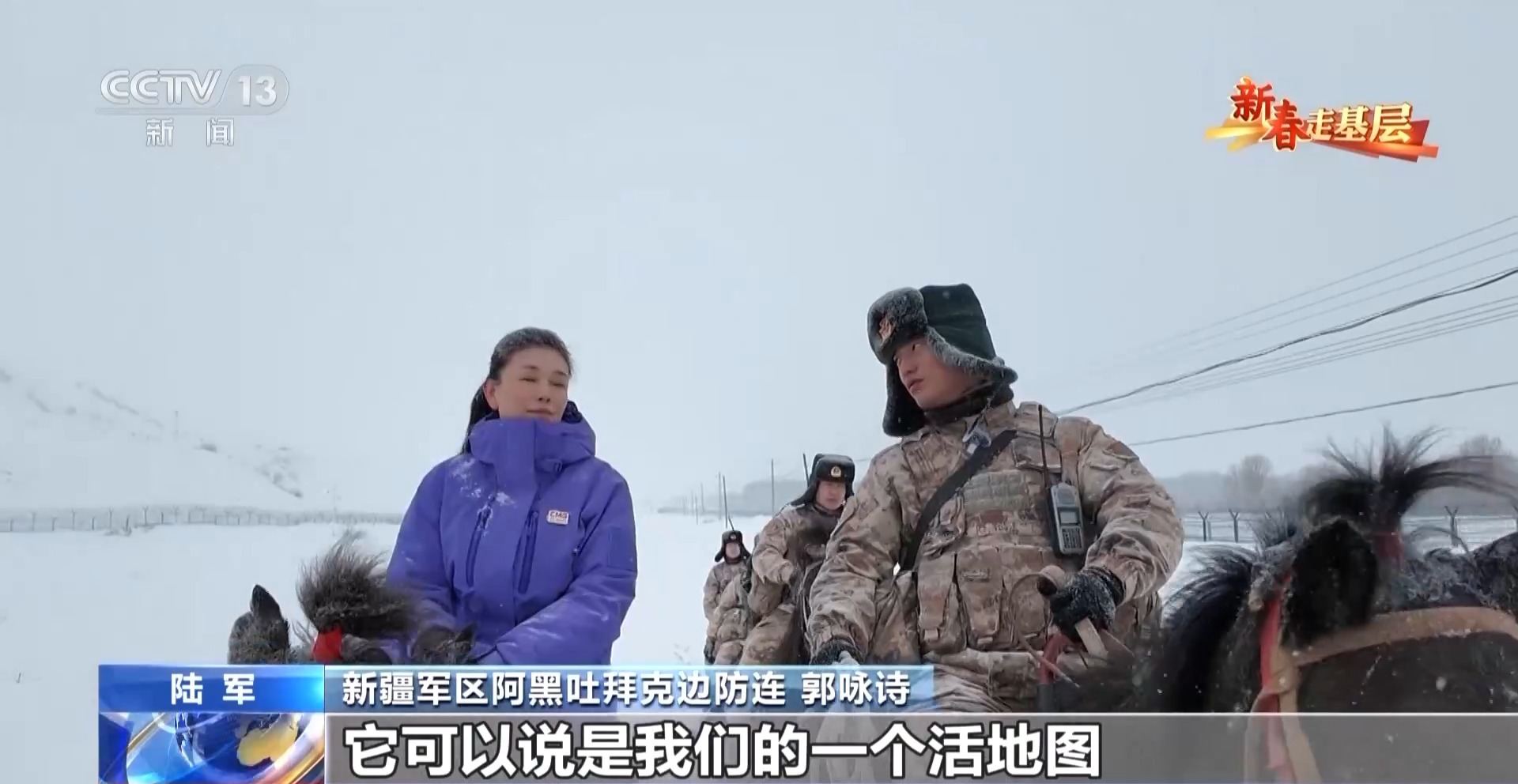 总台央视记者 刘洁:第一次骑上马背,比想象的要高很多,而且颠簸得厉害,心里很紧张。双腿要时刻夹紧,双手要攥缰绳,才能在雪地上保持平稳。仅仅是跟随队伍缓行,不一会儿就会觉得腰腿酸软。可想而知,官兵们长年累月在复杂的地形中骑行巡逻,需要多么过硬的本领和毅力。