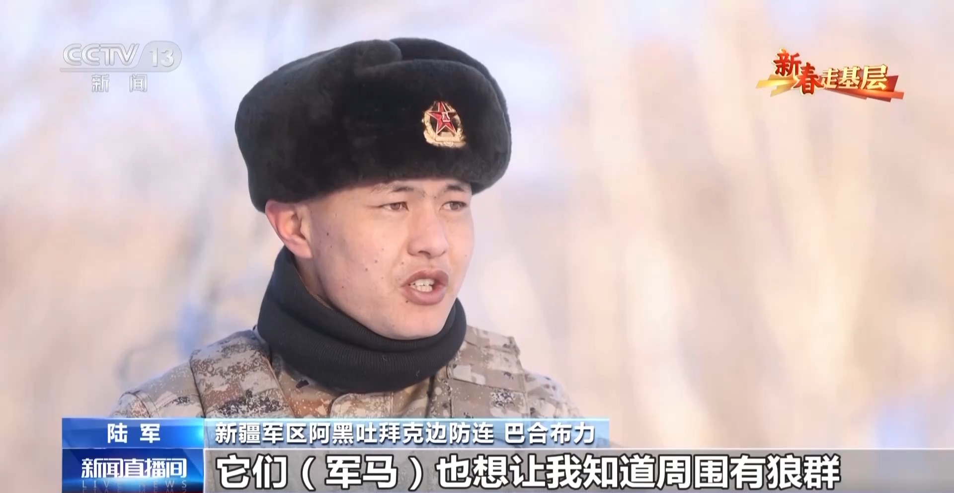 新疆军区阿黑吐拜克边防连 巴合布力:春节战备,我和我的马都不能松懈,军马也是全天背着鞍子,随时待命。在外人眼里,在边防连就是骑马、天天赶马,但是我们自己觉得,我也在时时刻刻准备为国家牺牲,非常值得。