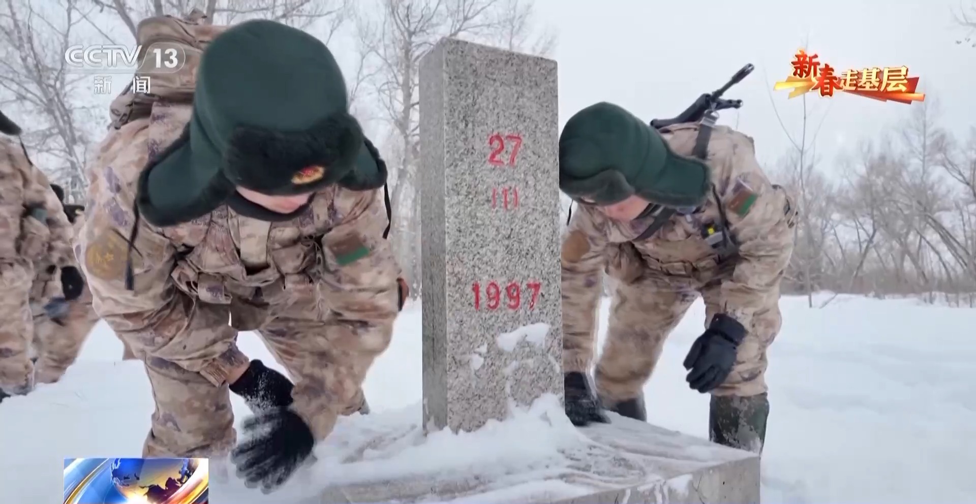 历经八个小时的风雪跋涉,穿过沙山、沼泽、白桦林,27号界标终于出现在视野中。官兵们下马,拂去界标上的积雪。新兵李垚脸上最初的紧张已褪去,透出战士的坚毅。