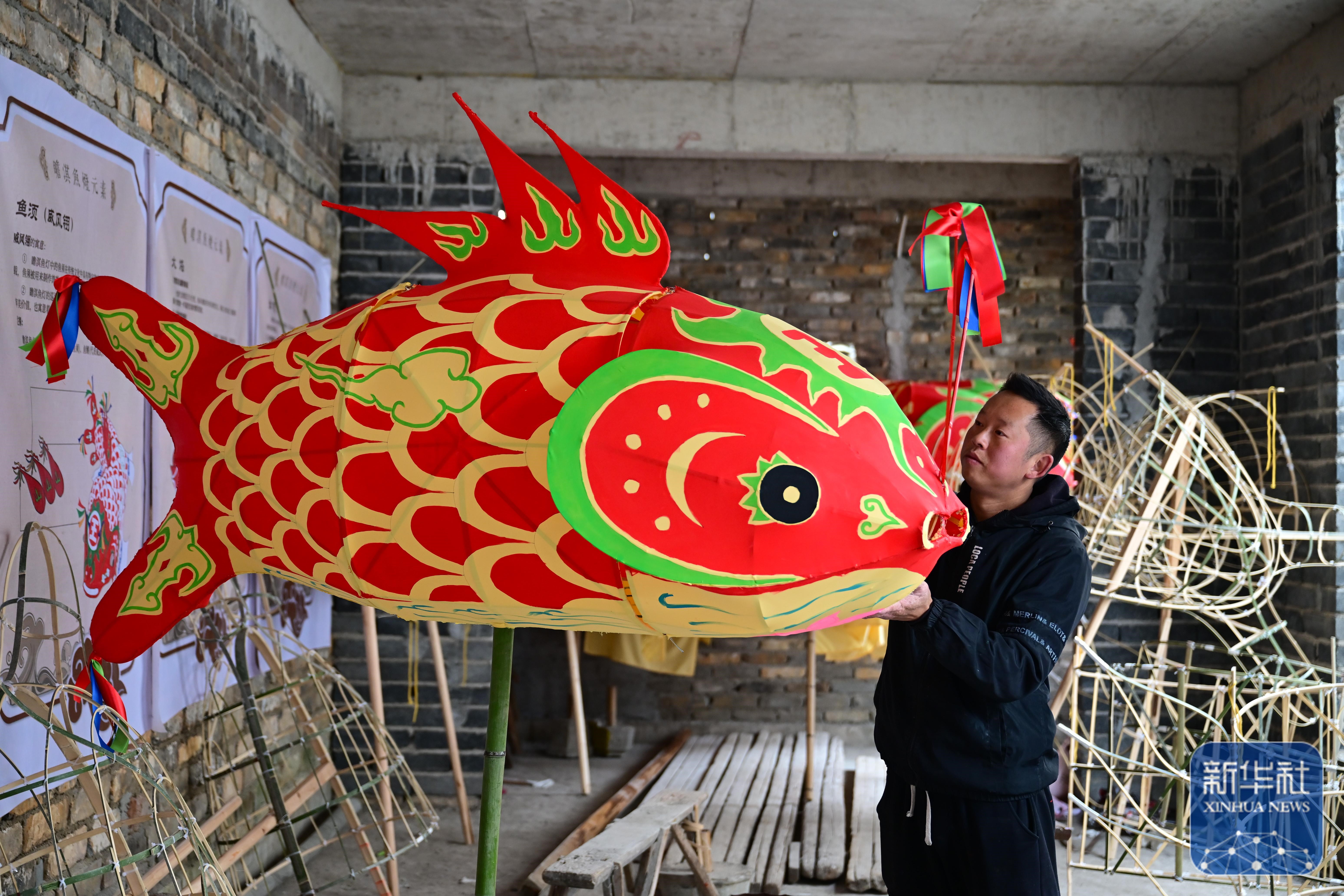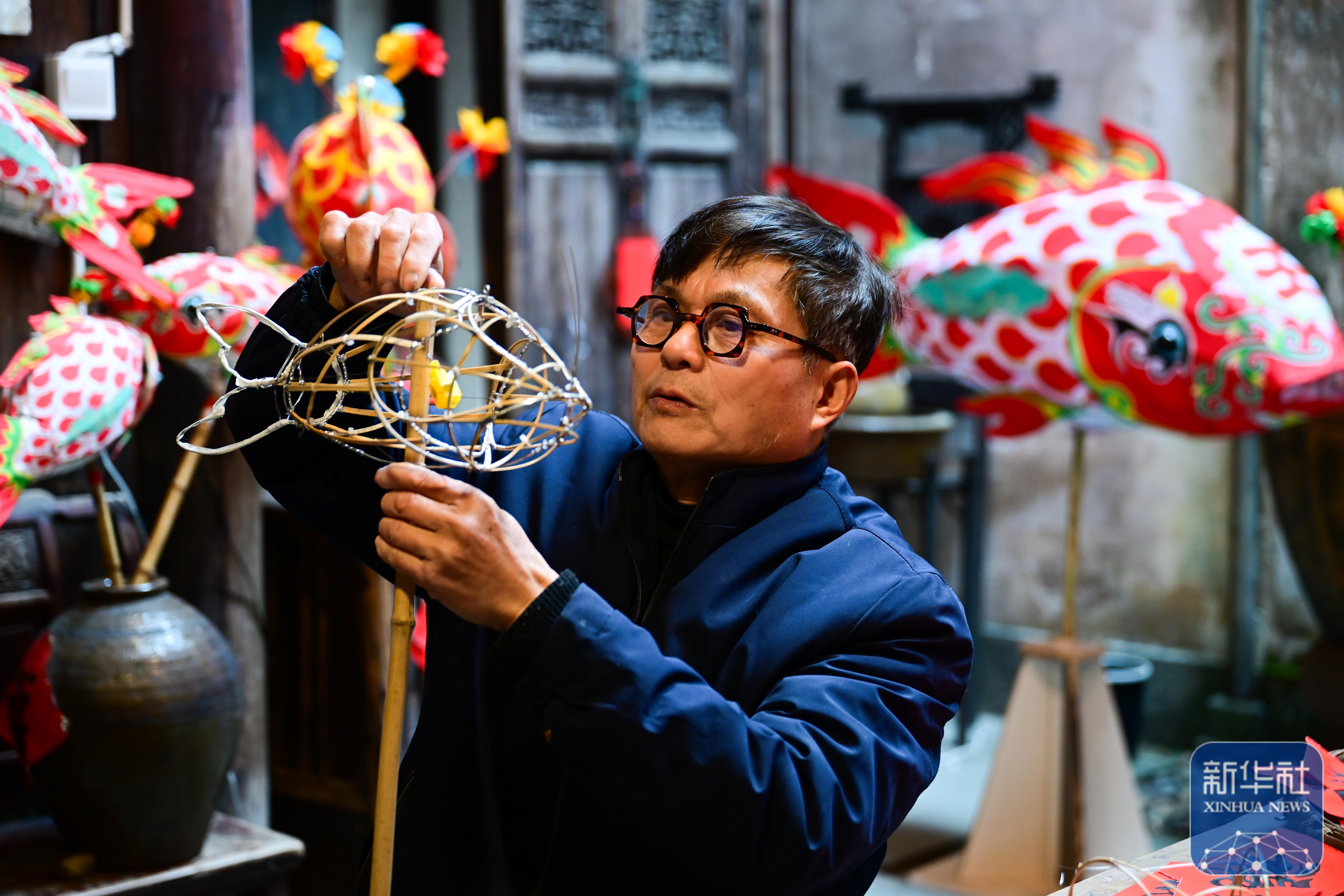1月29日,瞻淇村的县级非遗项目瞻淇鱼灯代表性传承人汪卓荤在制作鱼灯。
