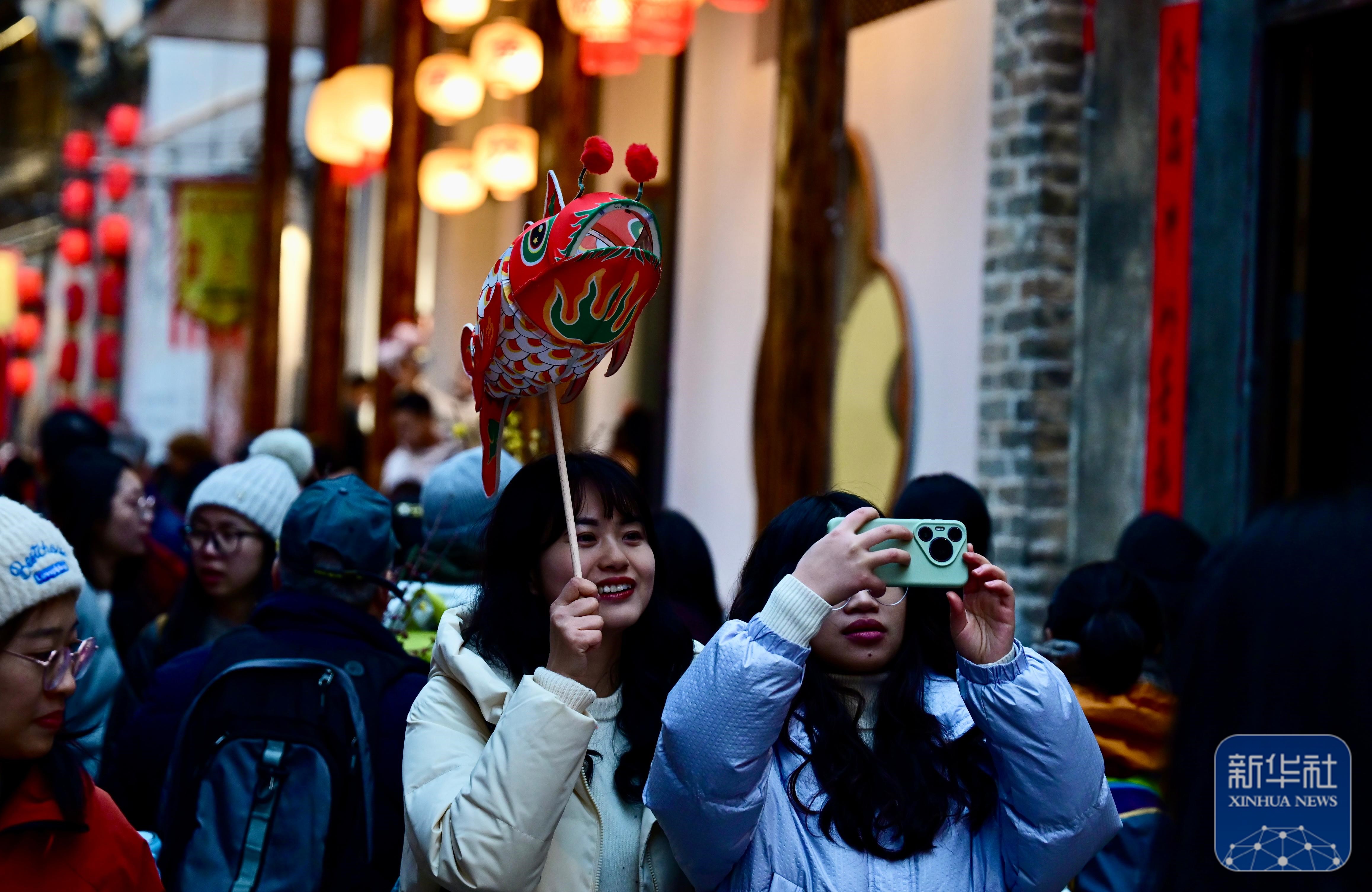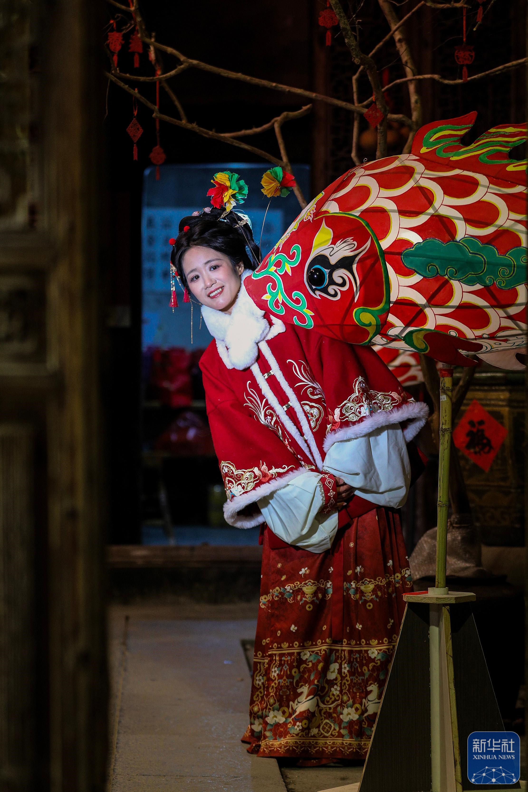 2月7日,游客在瞻淇村和鱼灯合影。
